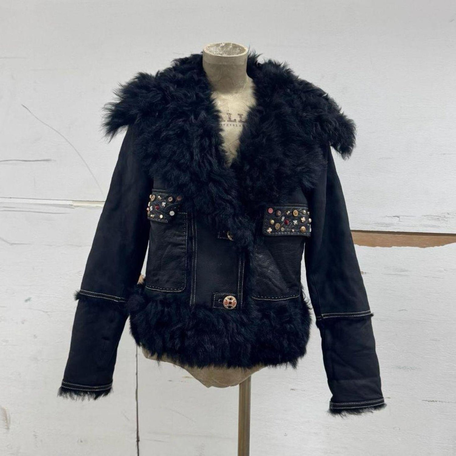 Vintage Black Gold Embellished Leather & Shearling Statement Jacket
