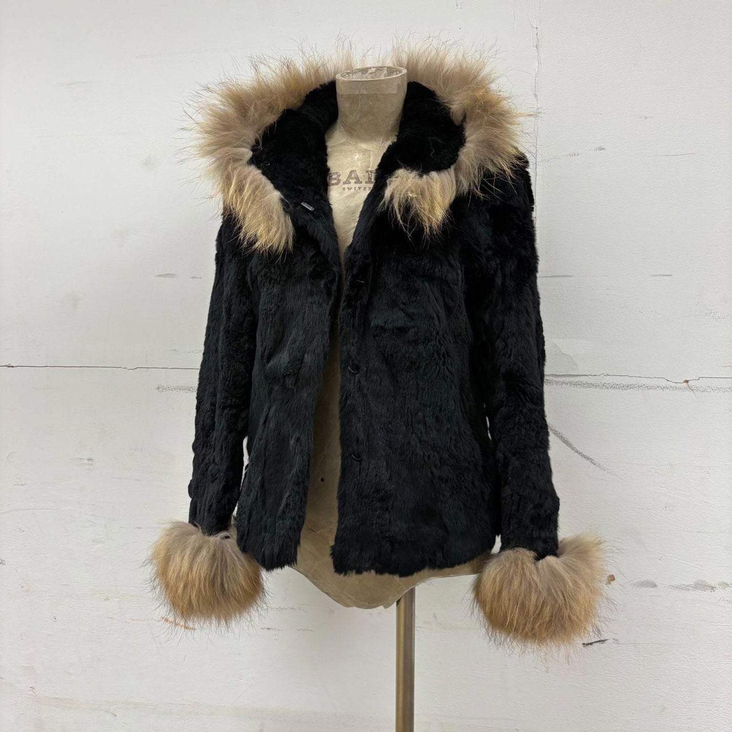 Vintage Y2K Jet Black Rabbit & Fox Fur Hooded Jacket