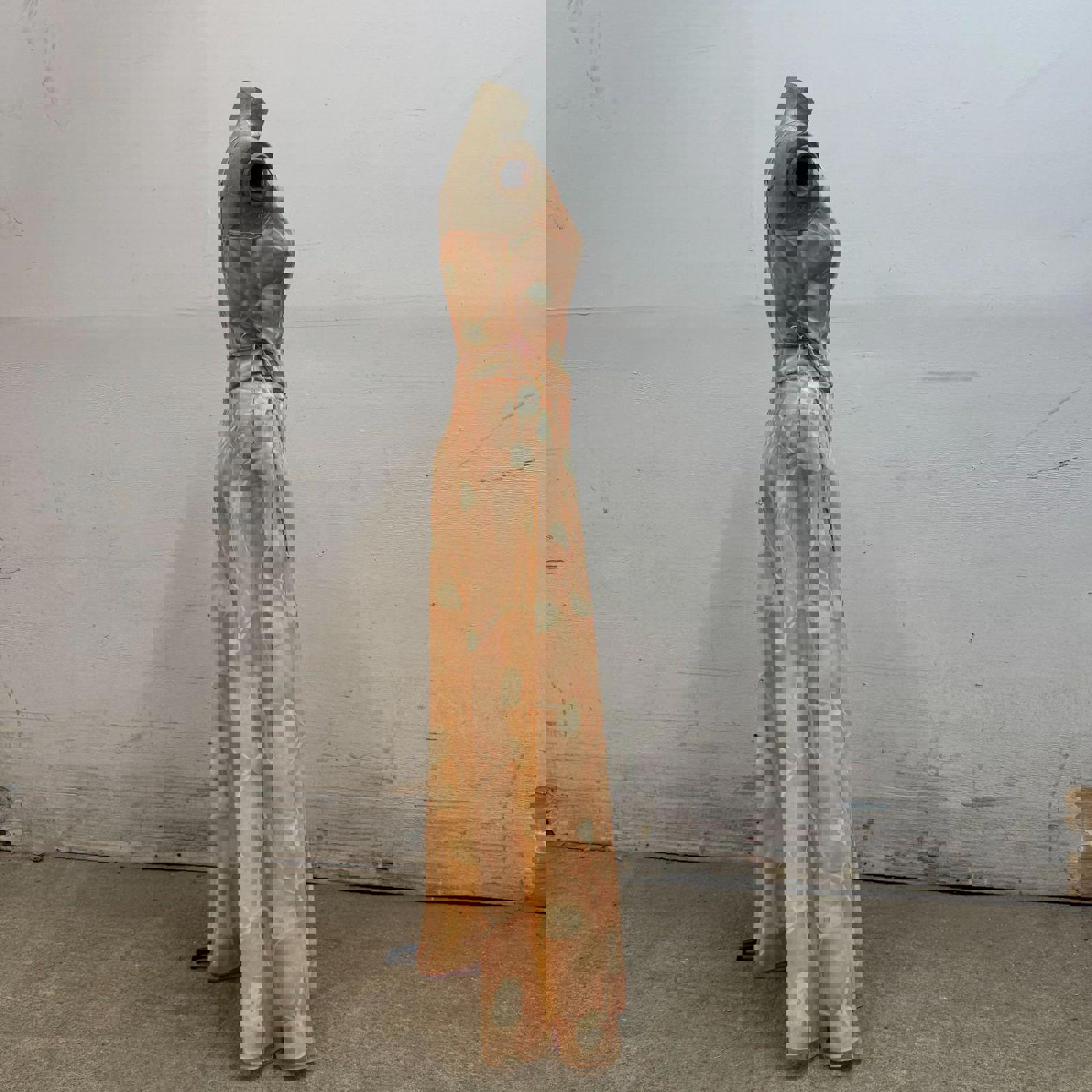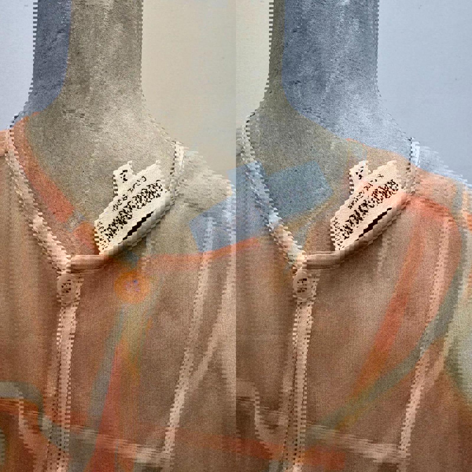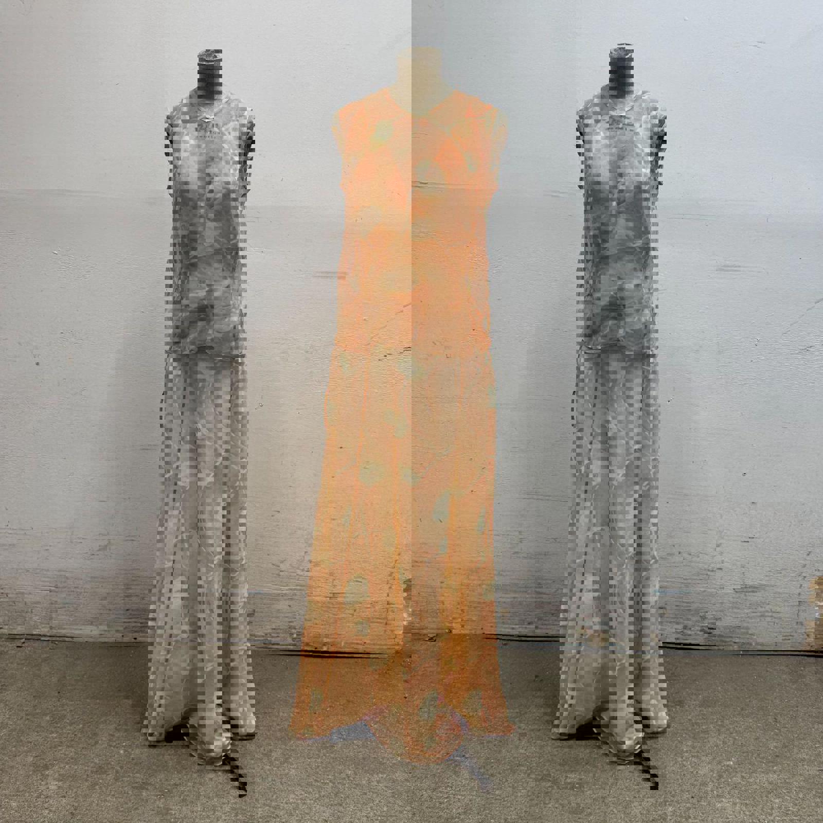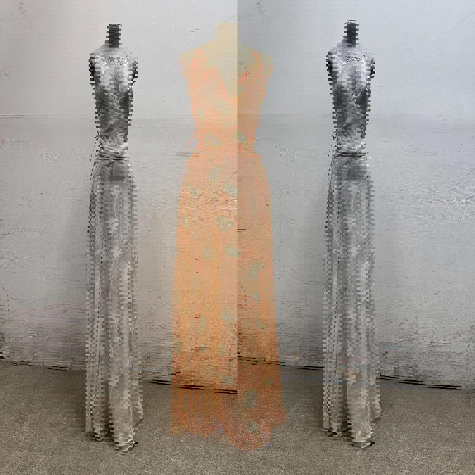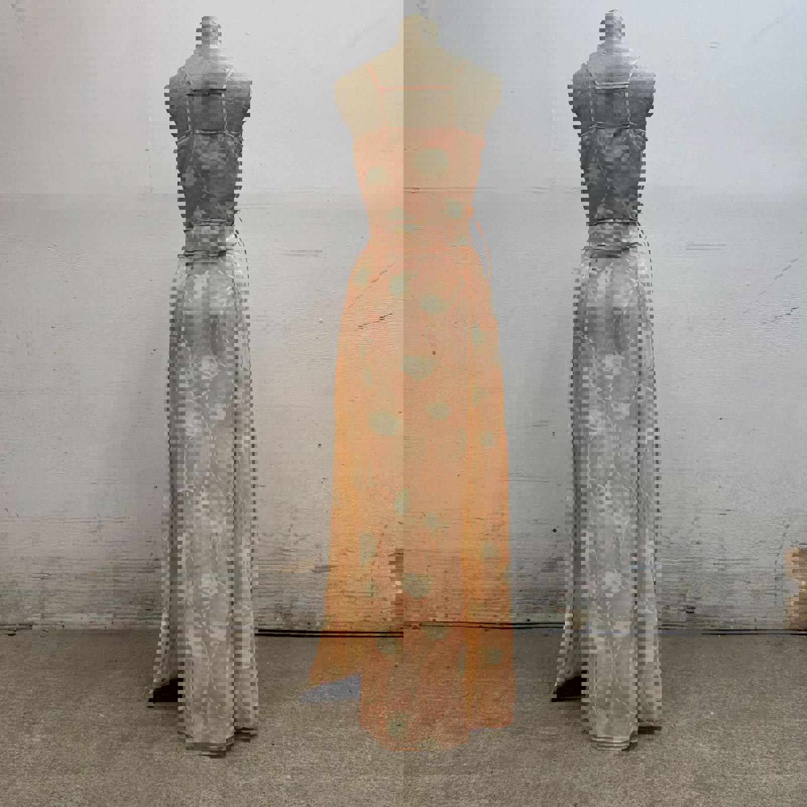 An exquisite and rare 3-piece archival ensemble from Giorgio Armani Le Collezioni. This 100% silk set is a 1990s runway sample, sourced from my mom, a former Armani production manager. It includes a delicate wrap open back camisole, high-waisted maxi skirt, and matching sheer over-blouse featuring a ethereal, hand-painted style floral motif in soft peach and ivory.