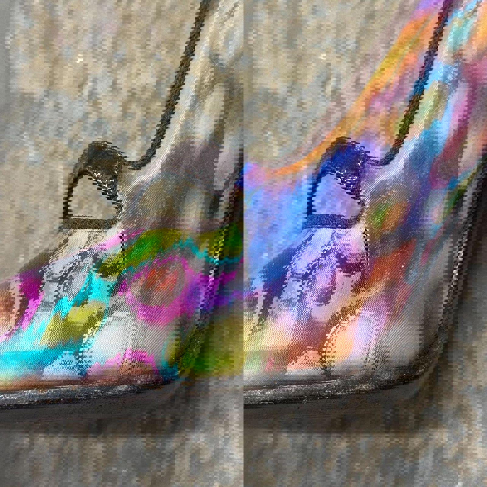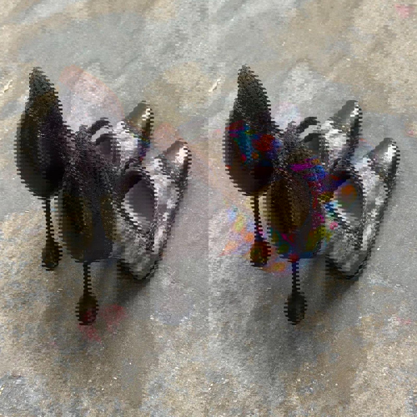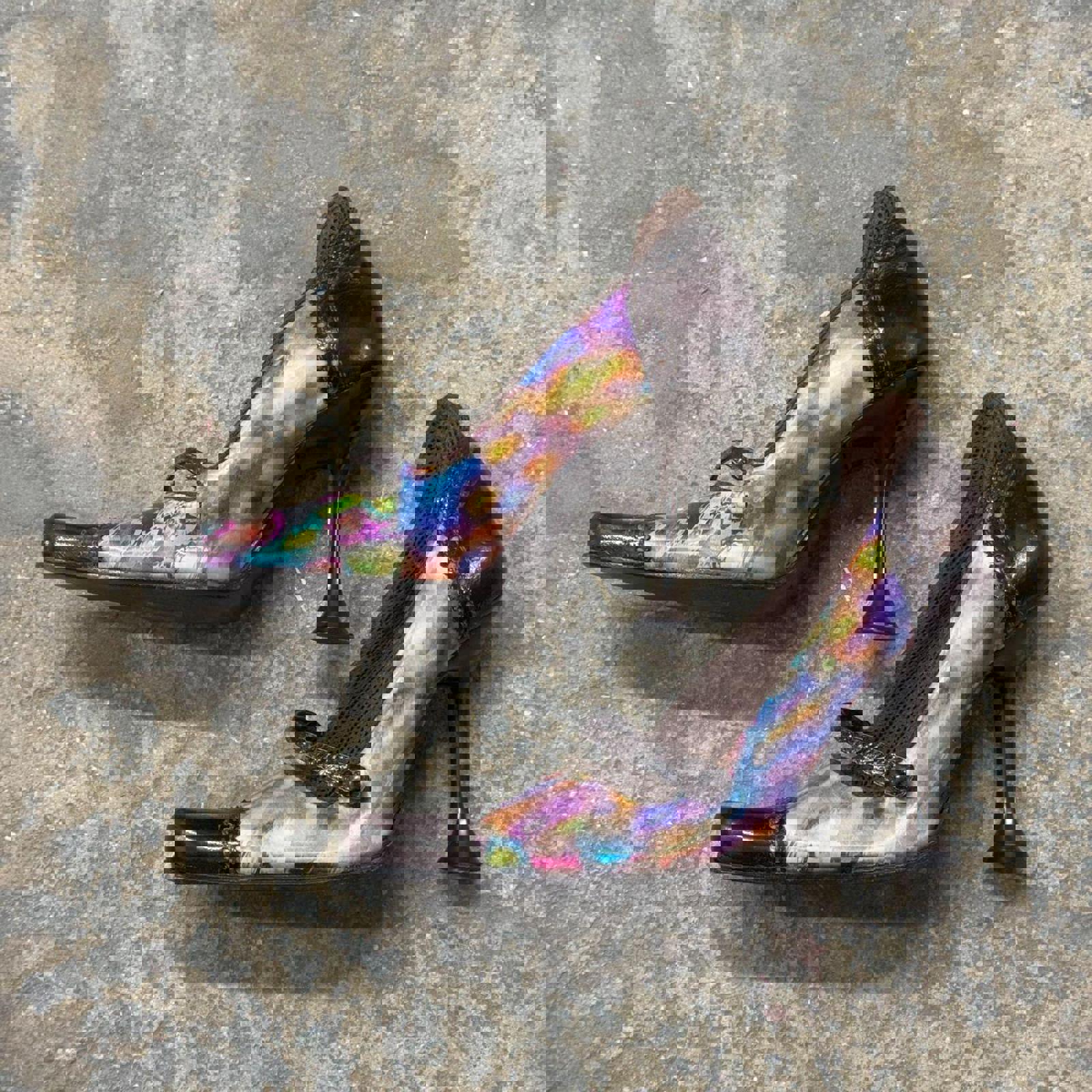 Condition: Good vintage condition. Please note a small vertical crack in the holographic material on the inner side of one shoe near the strap base; however, the structural integrity remains sound.