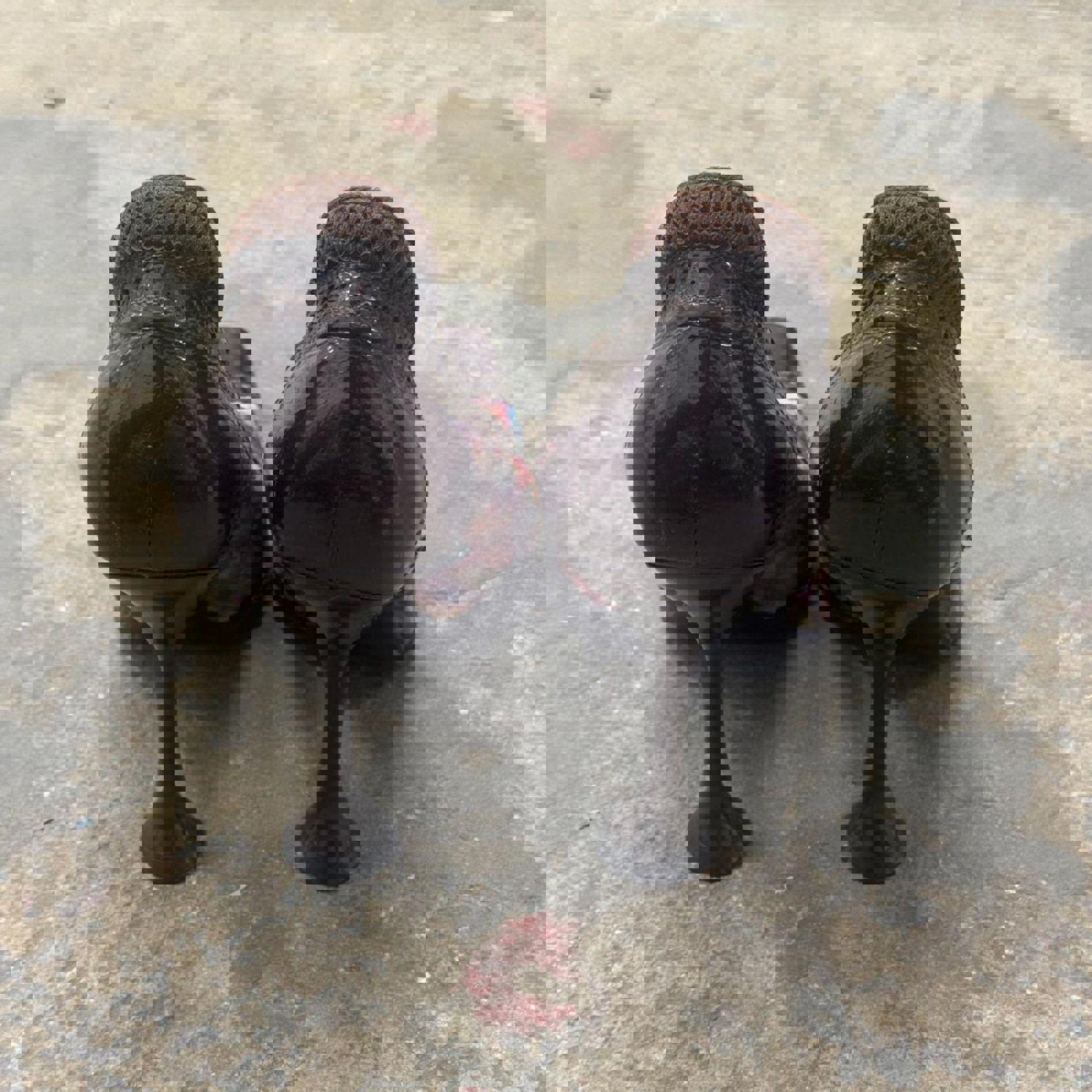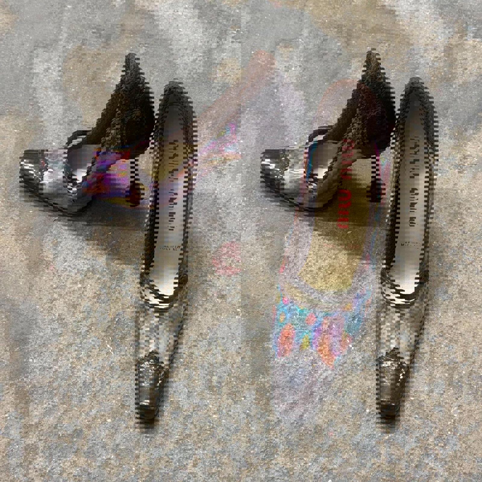 A stunningly rare archival find from Miu Miu, these heels are a masterclass in the brand’s late 90s/early 2000s "ugly-chic" avant-garde aesthetic. The design features a vibrant, multi-colored holographic psychedelic print across the body, contrasted by deep chocolate brown patent leather brogue detailing at the toe and heel. Structured with a slender Mary Jane strap and a unique sculptural pedestal heel, these shoes are a definitive collector's piece for any high-fashion archival enthusiast.