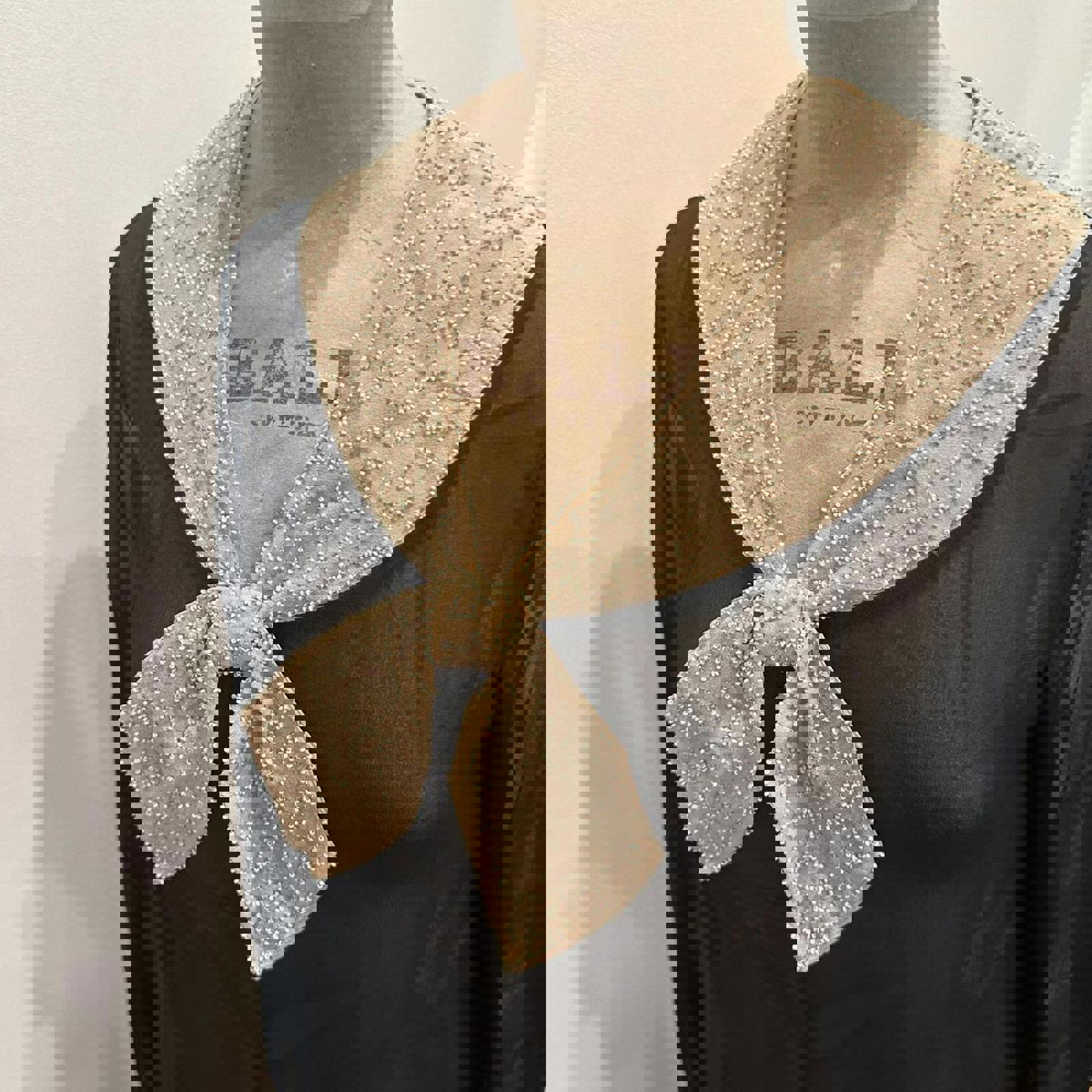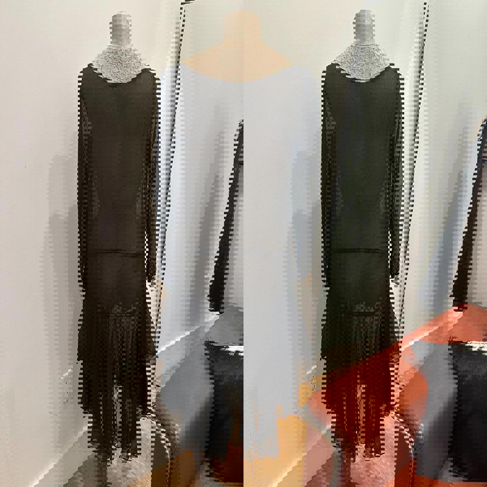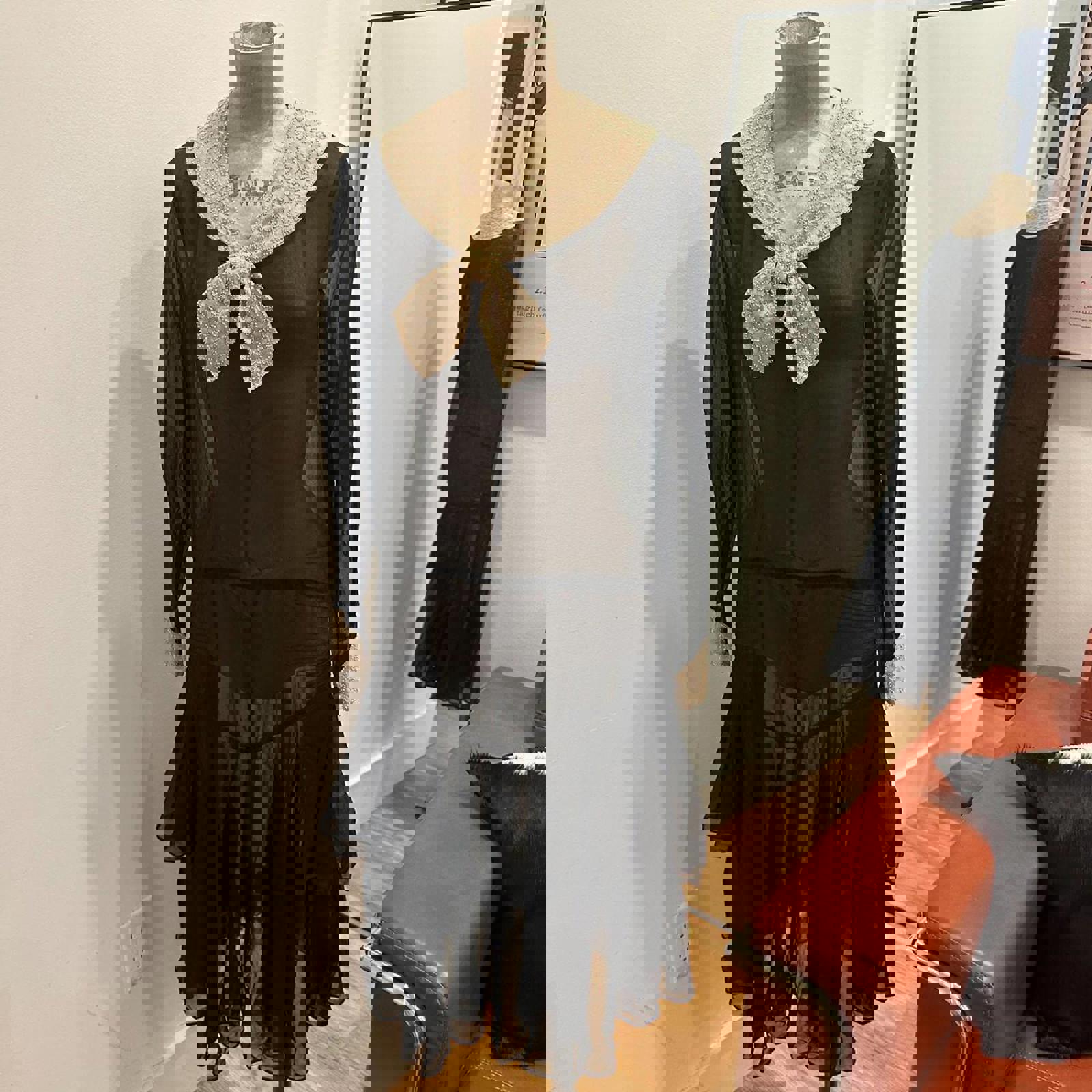 🖤 1920s Sheer Black Chiffon Dress with Beaded Sailor CollarExquisite late 1920s black silk chiffon dress featuring a sheer bias-cut body and tiered hemline, contrasted by an ecru beaded sailor collar and matching cuffs. The collar and bow are intricately hand-beaded in seed pearls, lending a delicate shimmer against the gauzy black fabric. Light and ethereal, this piece moves beautifully.