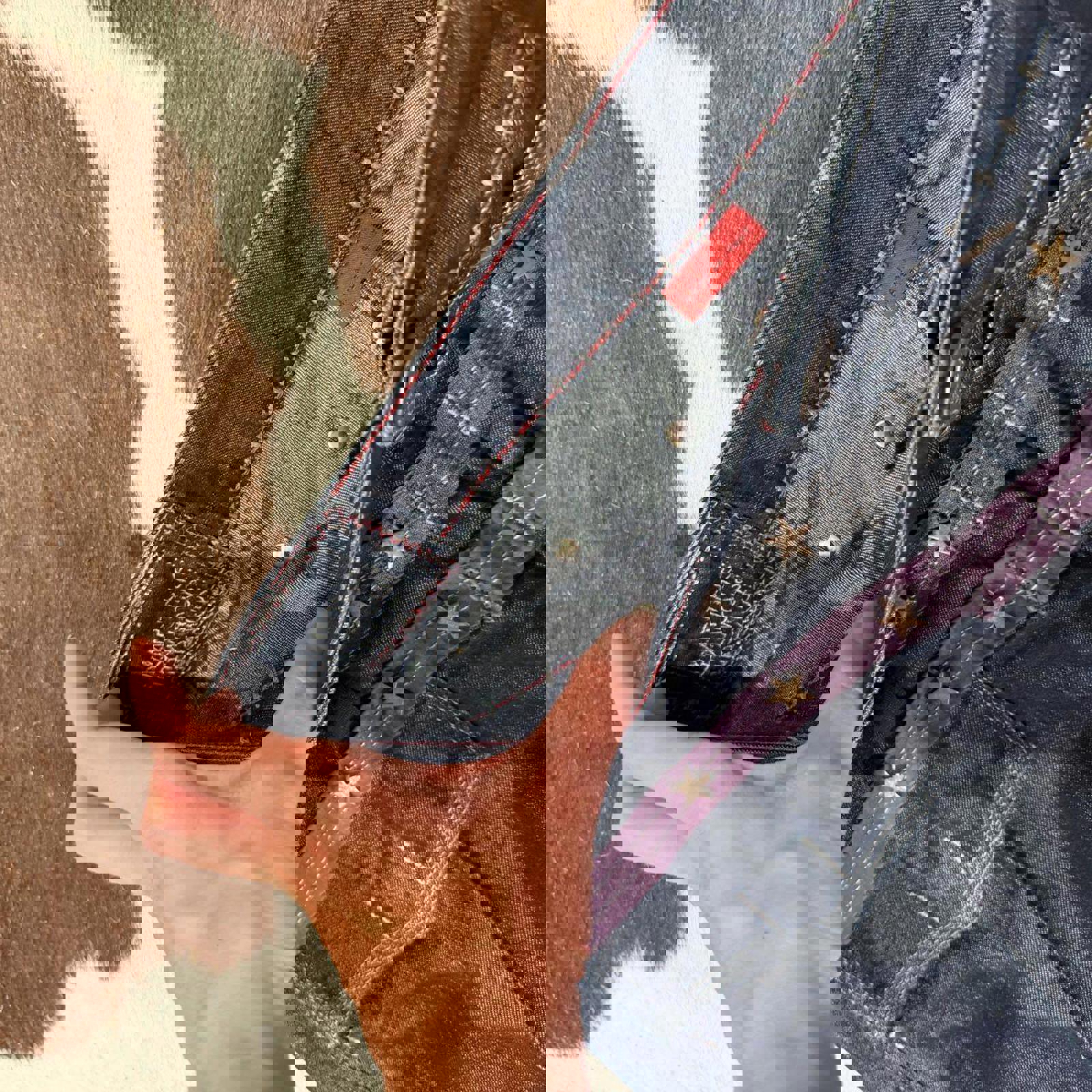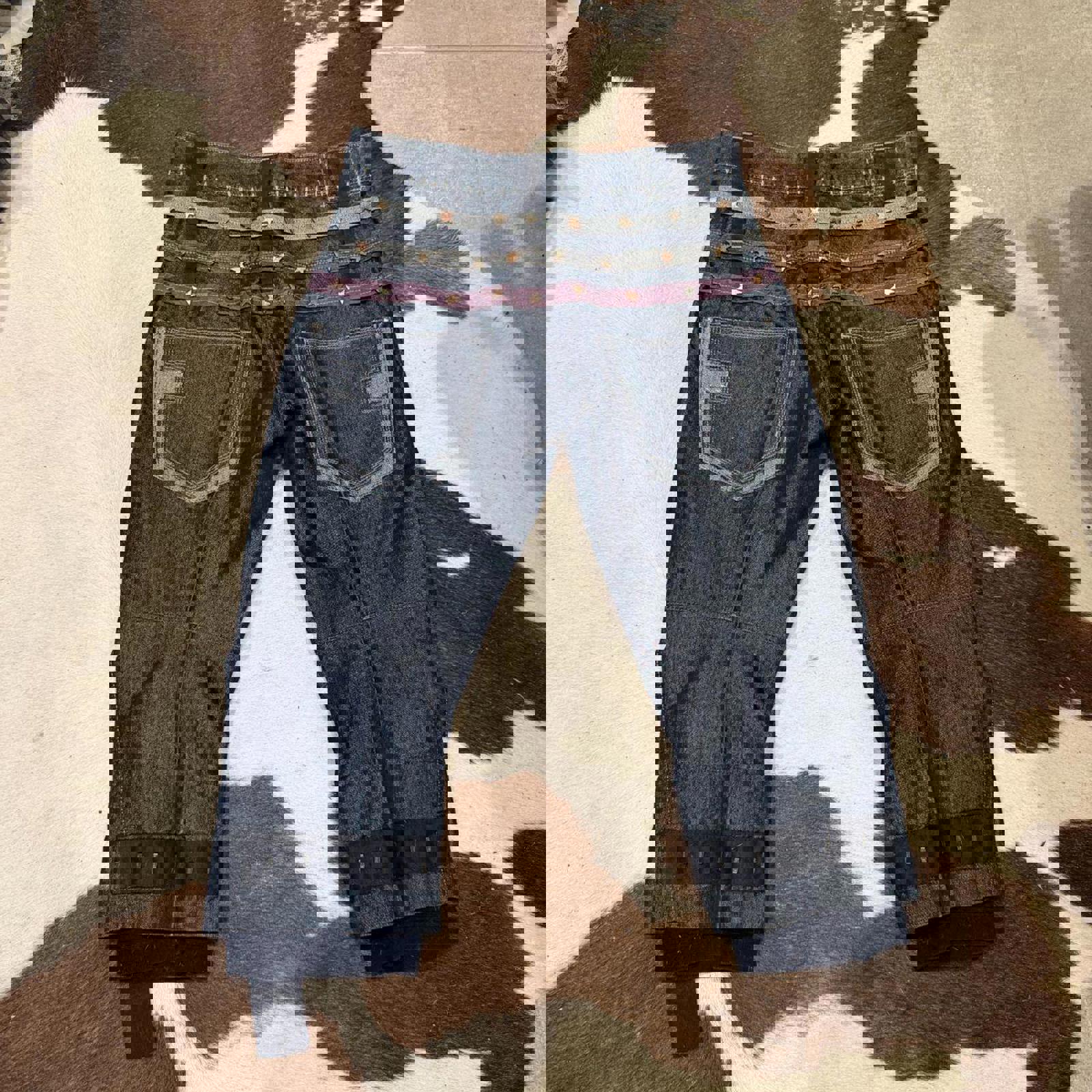 Keywords: French designer, luxury denim, raw selvedge, architectural design, deconstructed, reconstructed, patchwork, utility pants, cargo style, straps, hardware, embroidered stars, celestial, Y2K, baggy jeans, wide leg, statement denim, designer vintage, high fashion streetwear, collectible, investment piece, rare find