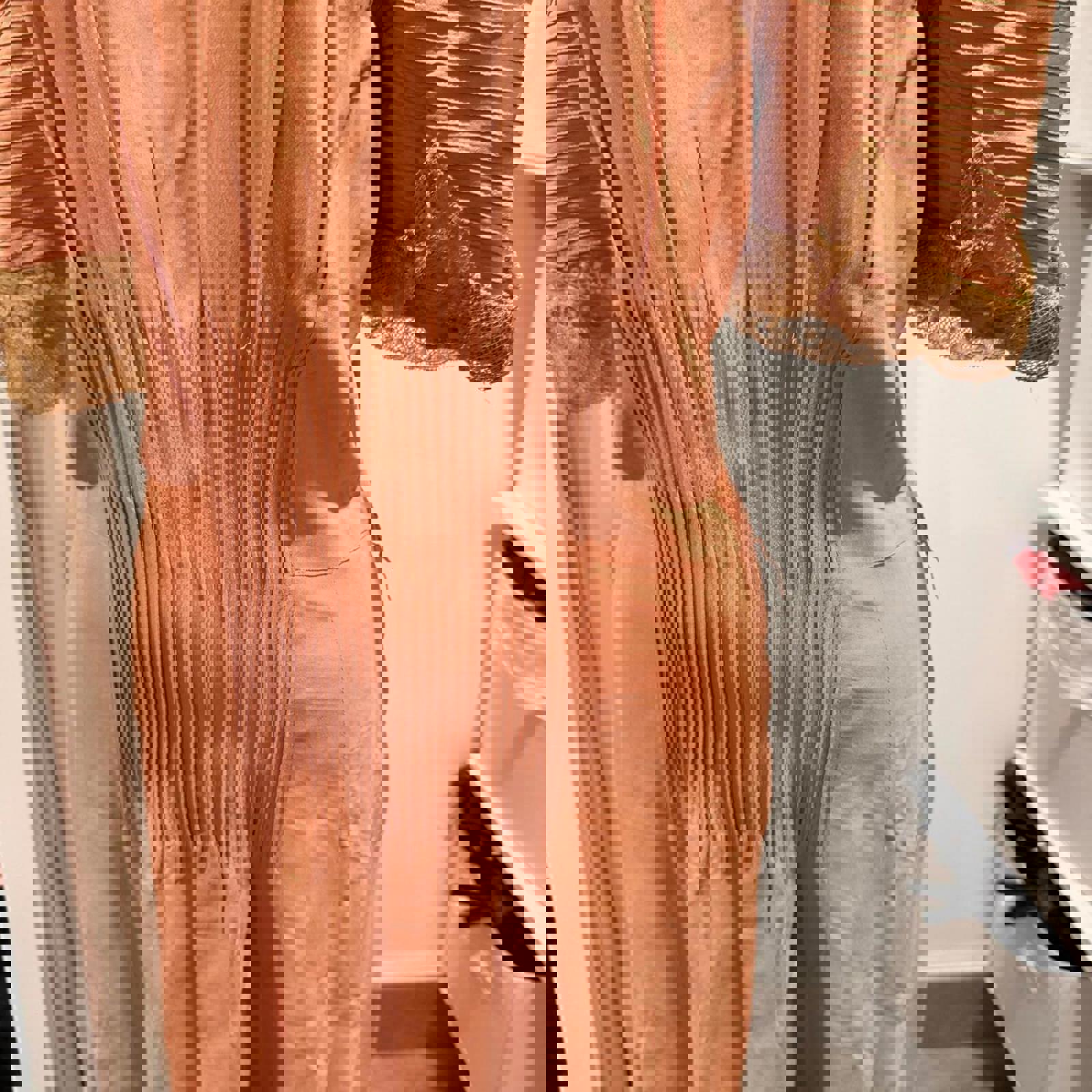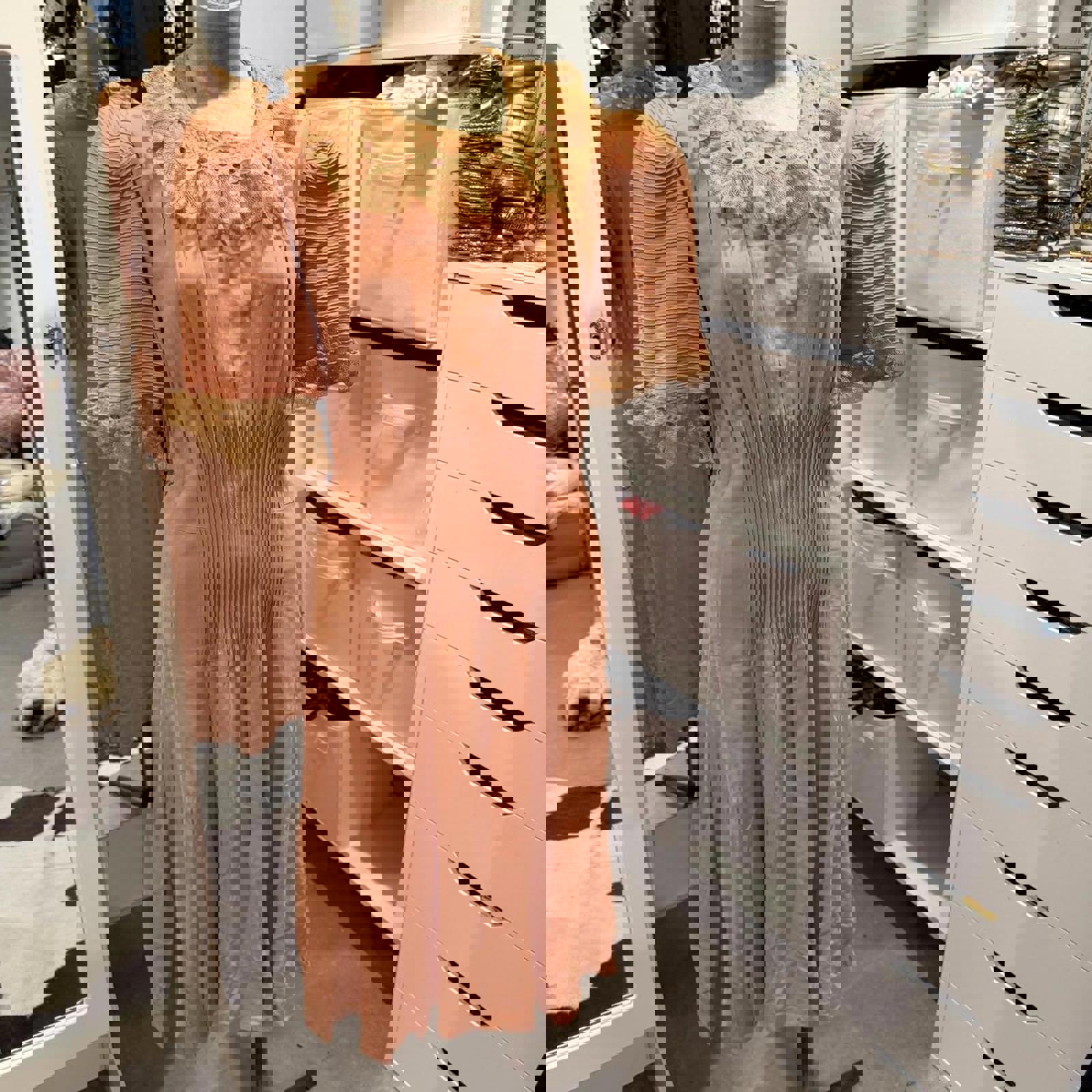 Exquisite late-1930s day dress in soft peach silk with gold lace trim at the collar and sleeves. Features dramatic pintucked puff sleeves, a fitted pintuck bodice, and a gently flared bias-cut skirt. Side and back zip closures.