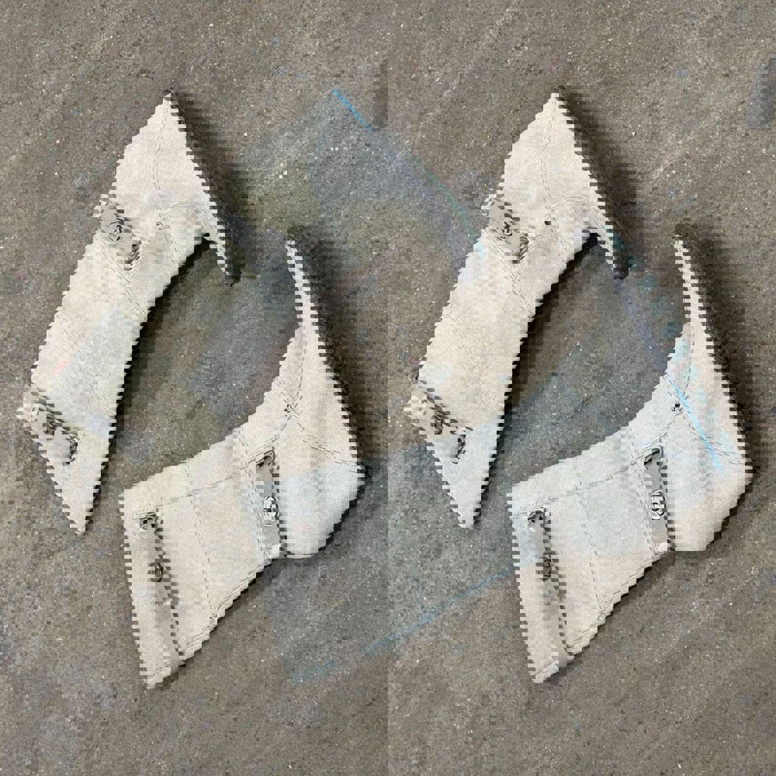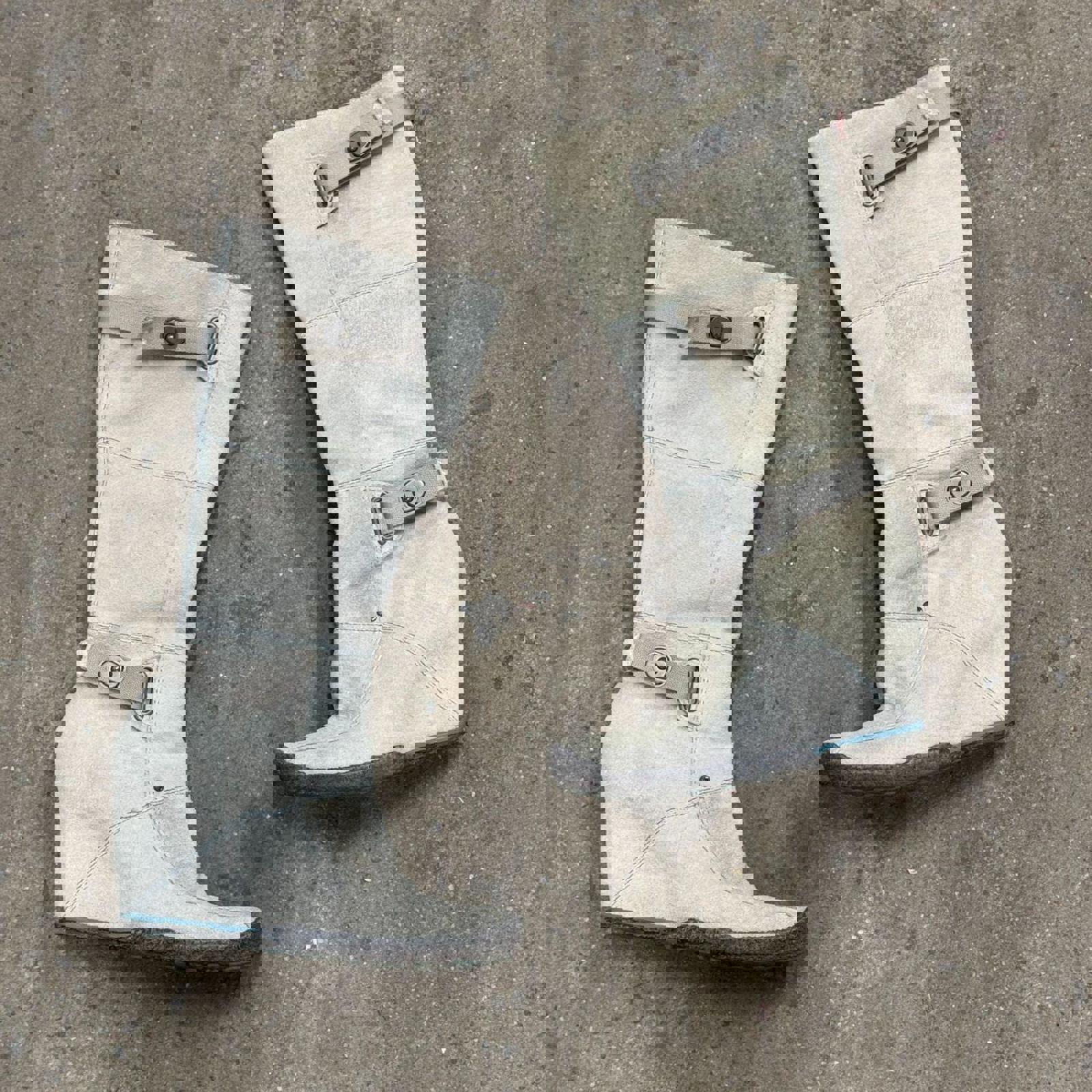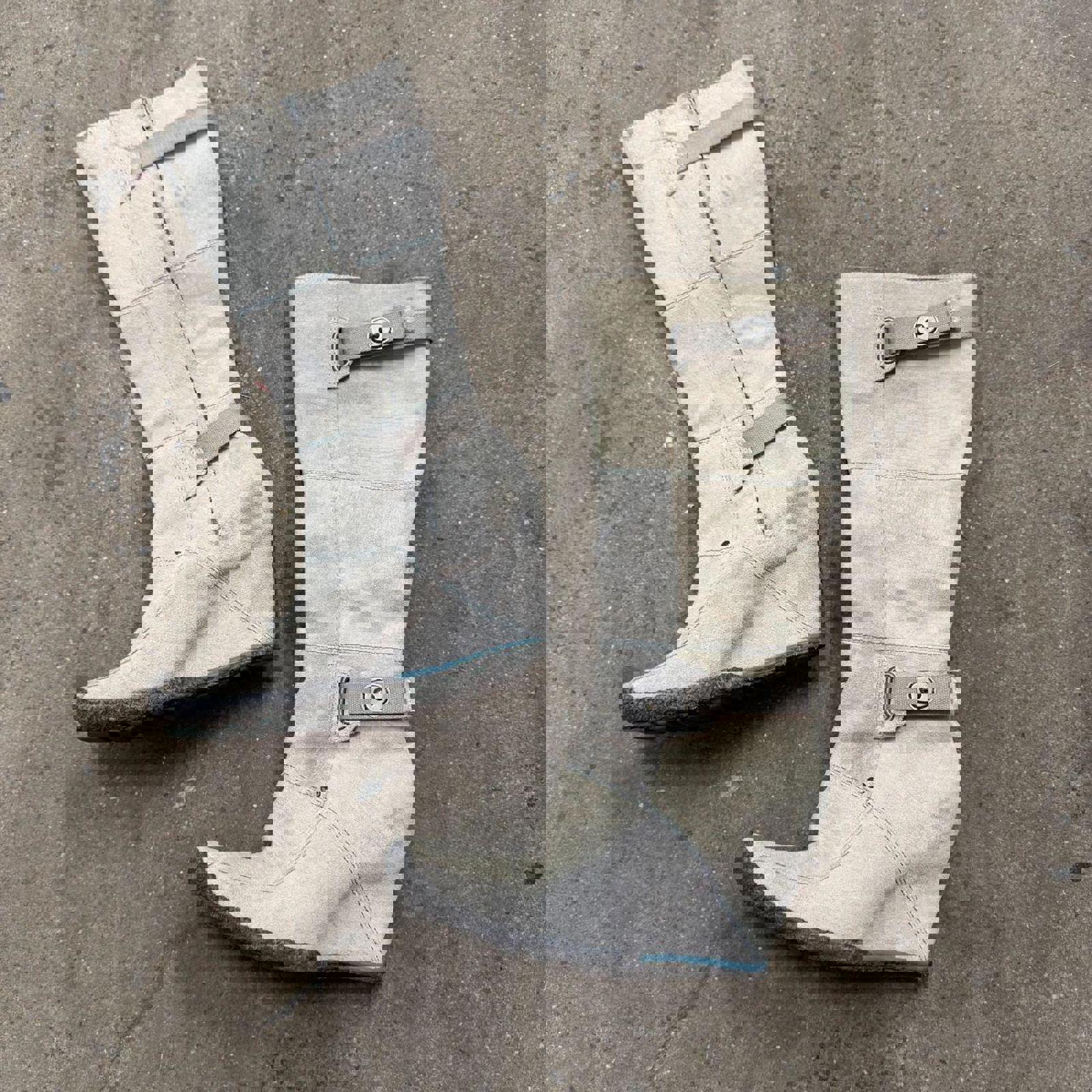 Ultra-rare archival Diesel moto-style wedge boots. Crafted from a unique distressed/bleached grey suede with contrast stitching and utilitarian buckle-strap detailing. These feature the iconic chunky sculptural rubber sole and a sleek, futuristic silhouette. A core piece for any 2000s archival collection. In excellent vintage condition with minimal wear to the soles and well-maintained suede. Isabel Marant vibes too.