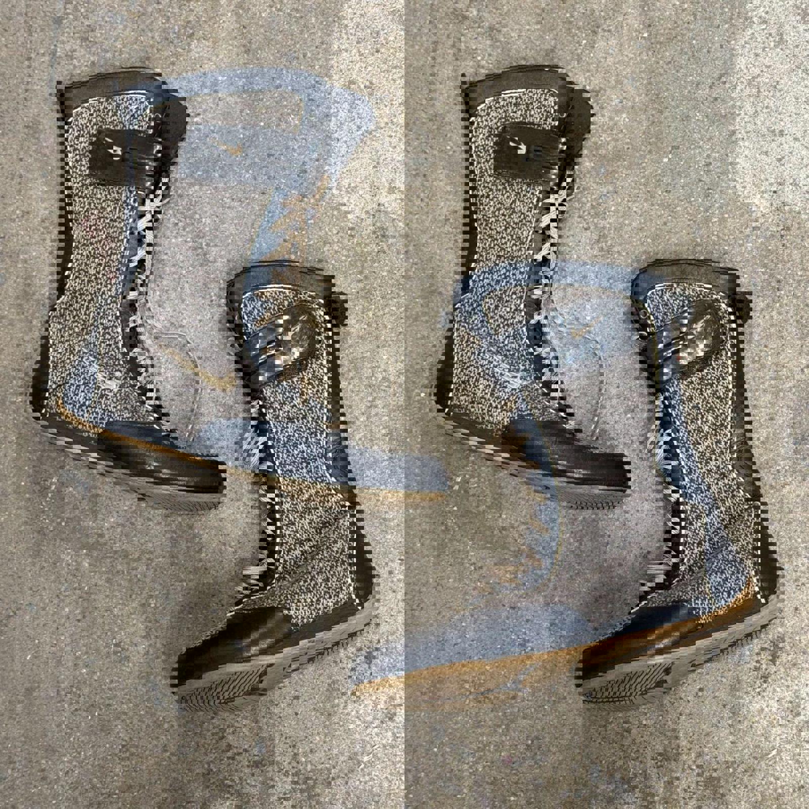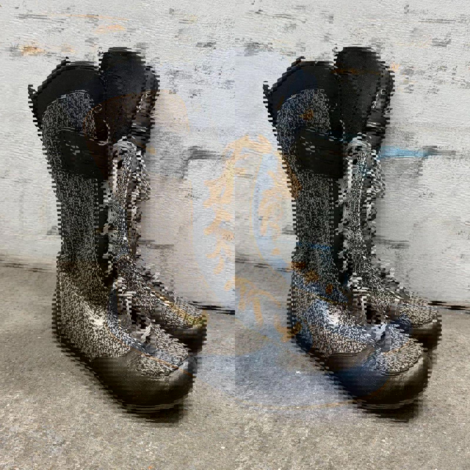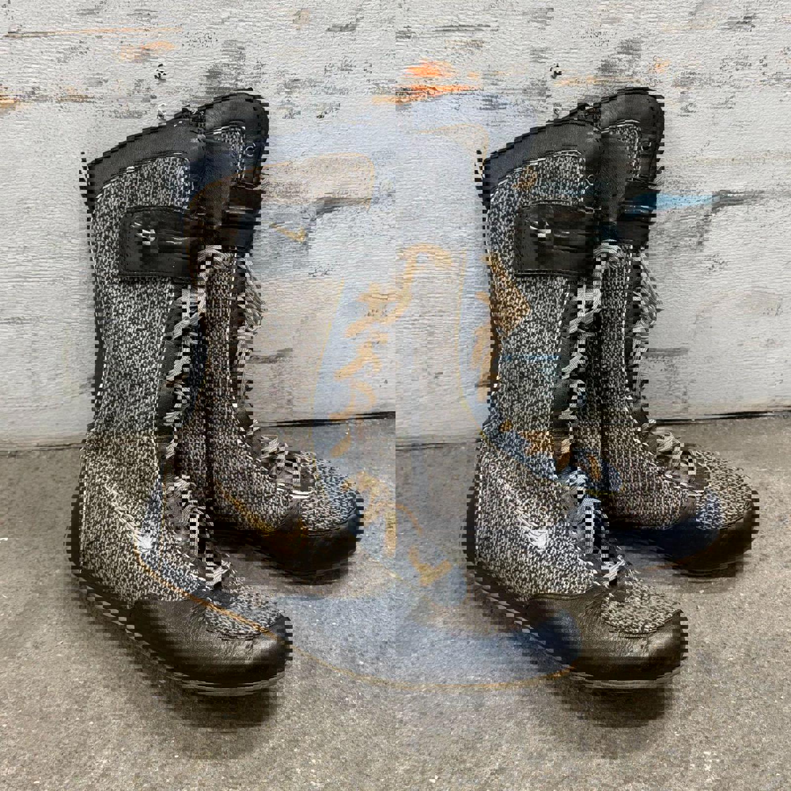 Archive Nike boxing-style boots featuring a unique grey and black tweed-patterned body with sleek black leather trim. Design includes a classic lace-up front, secure Velcro ankle straps with gold-tone branding, and a thin gum rubber sole. A standout 2000s silhouette that perfectly captures the cyber-y2k and techwear aesthetic.