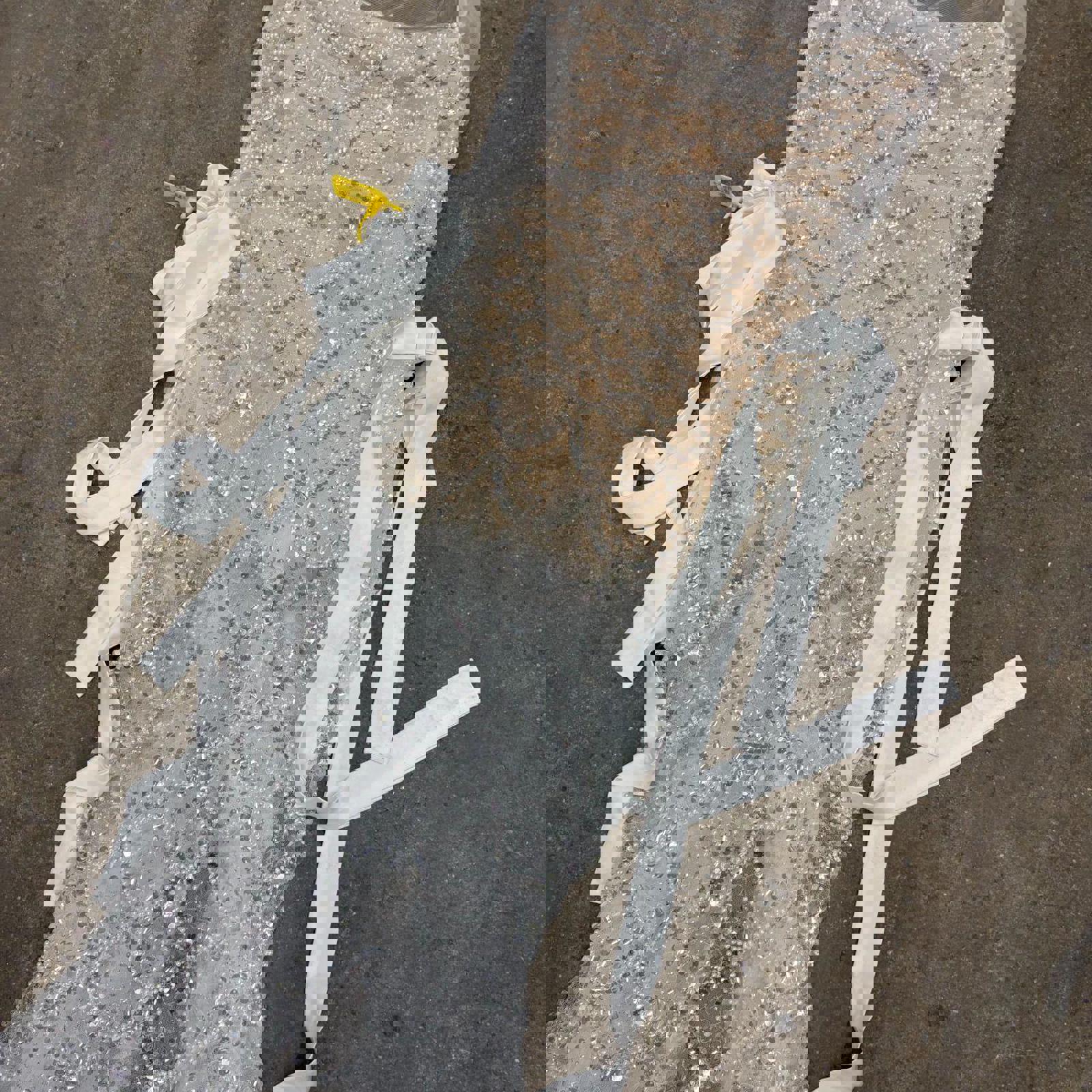 Stunning evening gown featuring an ethereal, mermaid-inspired silhouette. This architectural piece is designed with a nude-toned bodice that transitions into a sheer, floor-length skirt adorned with intricate silver sequin scalloping. The dress features a delicate halter neckline with long, sheer mesh ties and a dramatic open-back design. The sides are detailed with white satin ribbon ties, allowing for a customizable and flattering fit through the waist and hips. The hemline flares gracefully into a mermaid tail, creating a striking sense of movement. A perfect statement piece for formal events, editorial styling, or Y2K-inspired maximalist aesthetics.