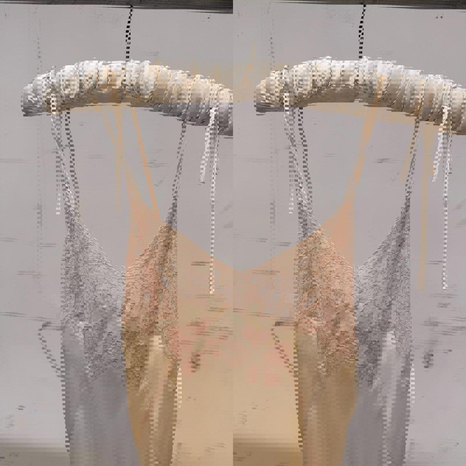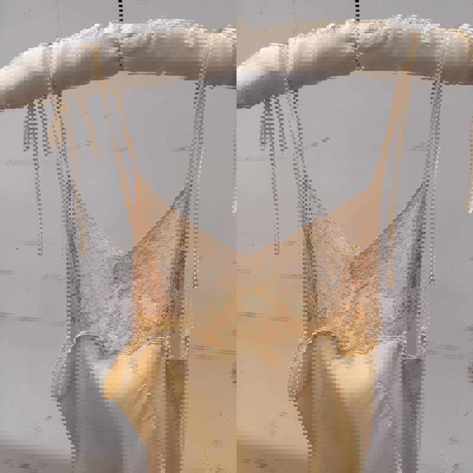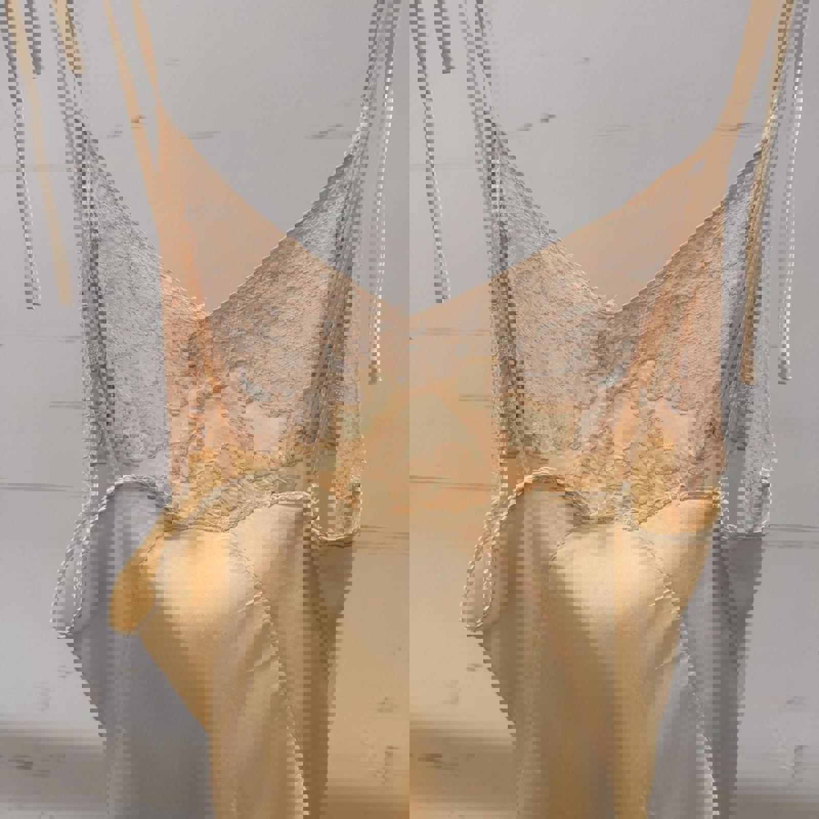 Vintage 1930s cream Silk satin Slip Dress. Bias Cut. Floral Lace Bodice. Midi length Gown. Over the head.