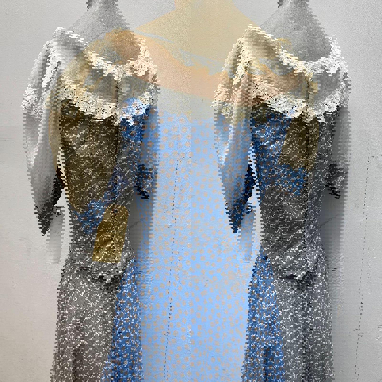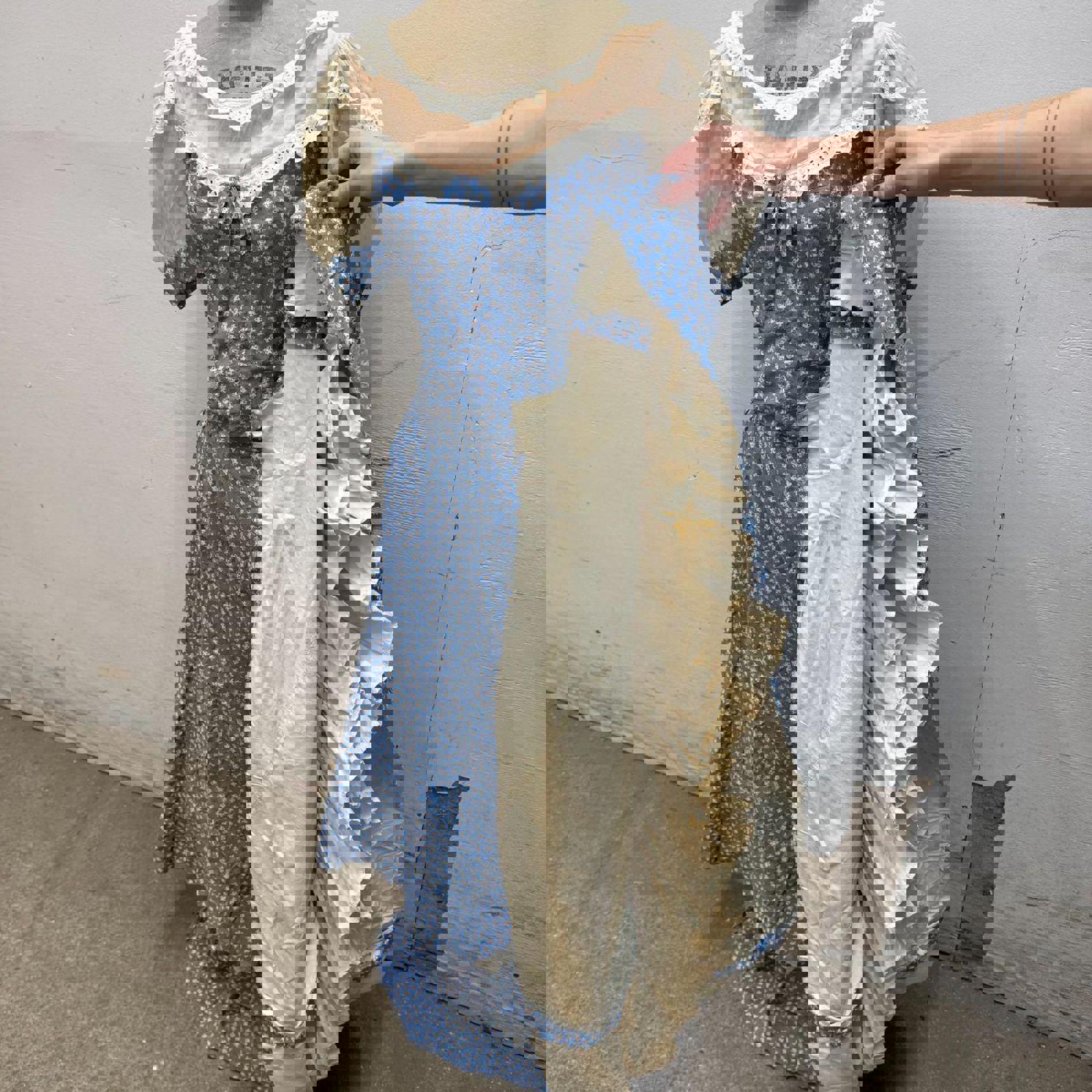 Fabric: Medium blue cotton featuring a dainty white floral calico print.