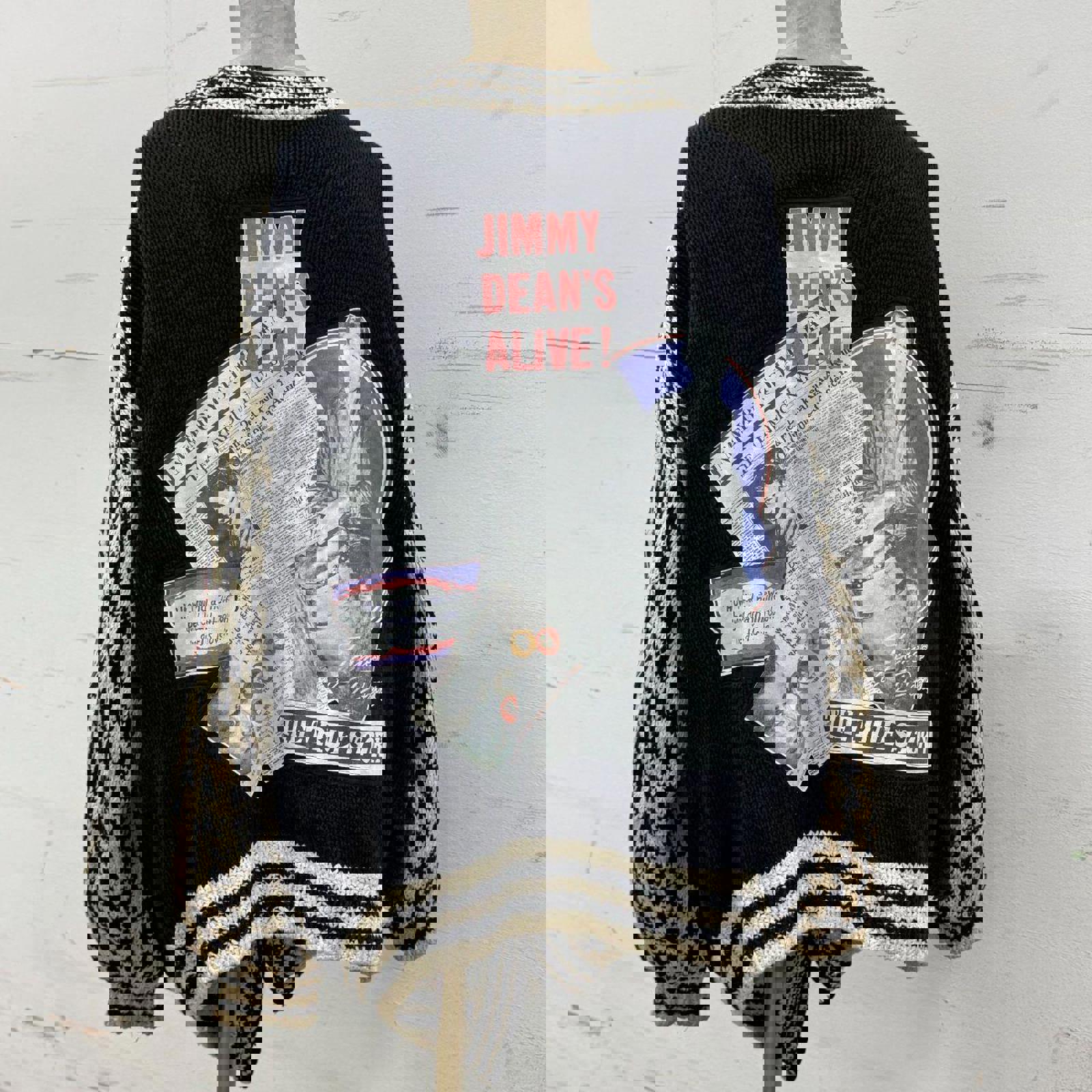 Vintage late-1980s licensed James Dean novelty cardigan featuring collage-style appliqué graphics and “C.A. of 56” branding. Chunky knit construction with taffeta lining. Statement piece from the peak James Dean revival era.
