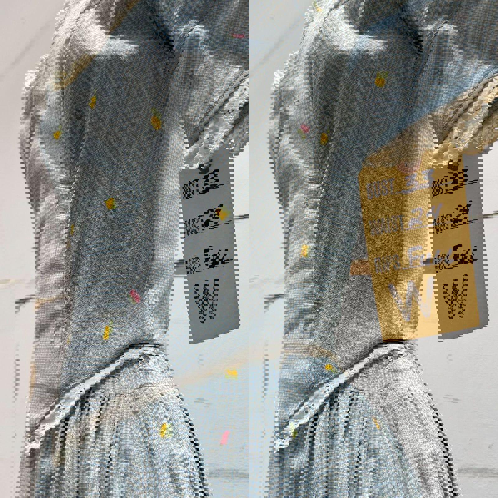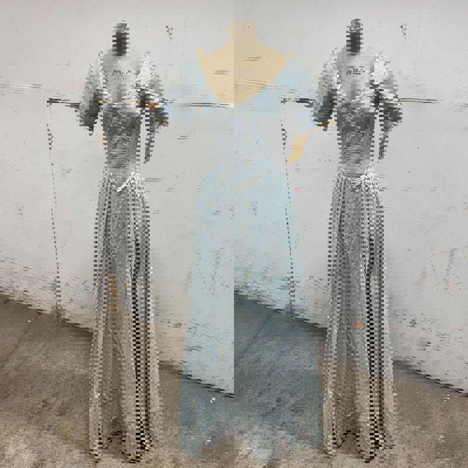 Sweetheart neckline with eyelet lace accents and short, tailored sleeves. The matching full-length maxi skirt is expertly pleated at the waistband for significant volume and retains its professional studio inventory tag.