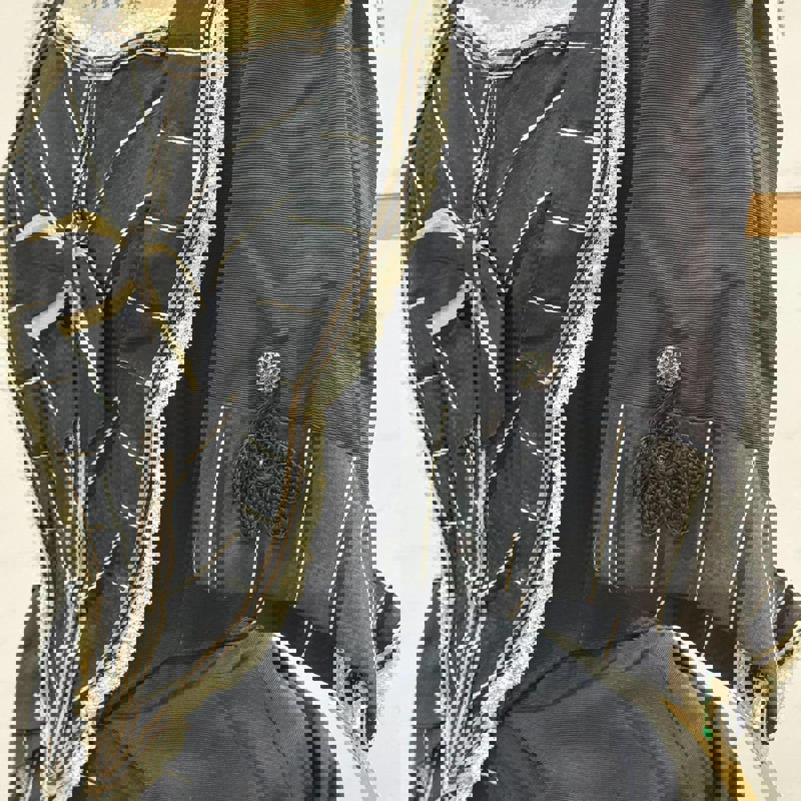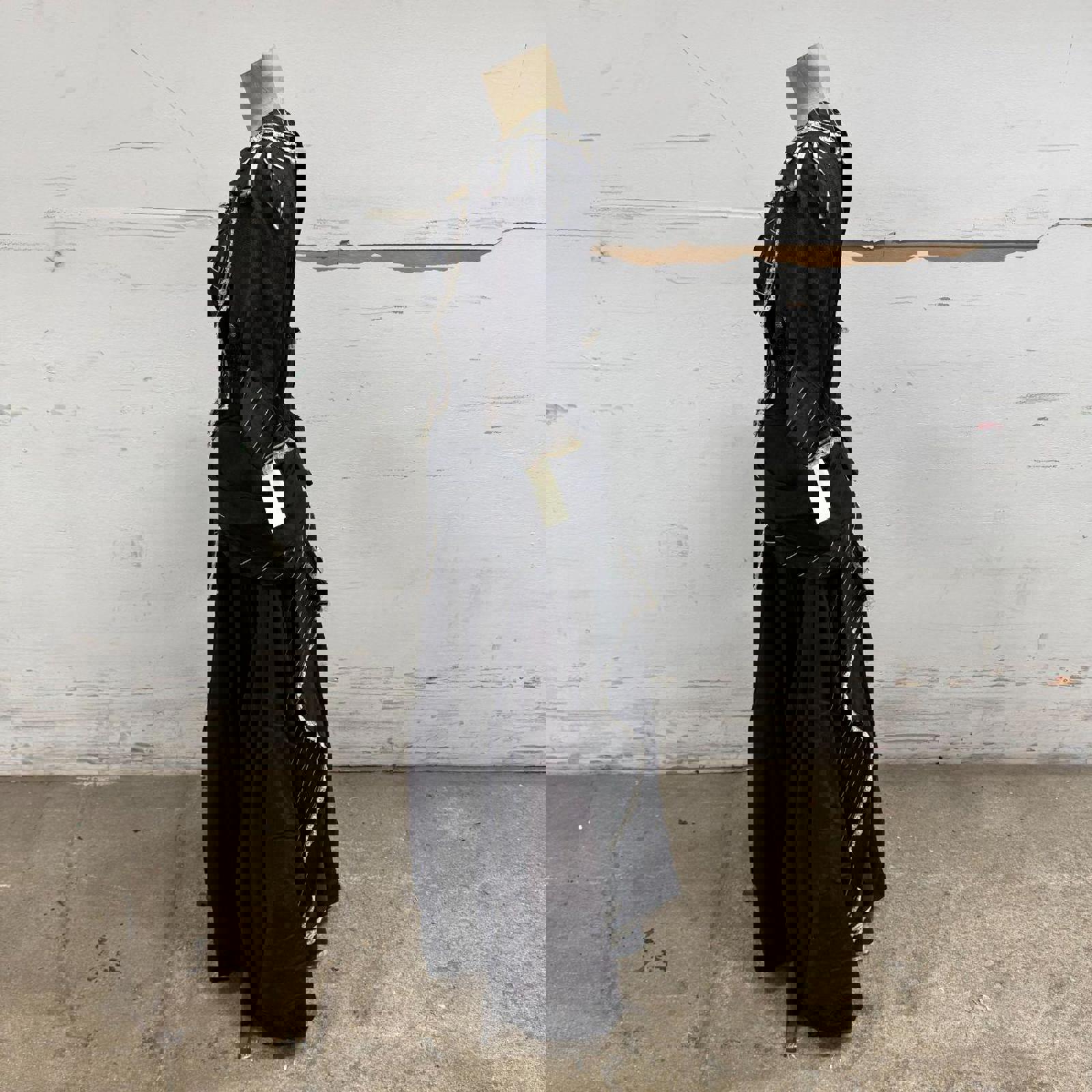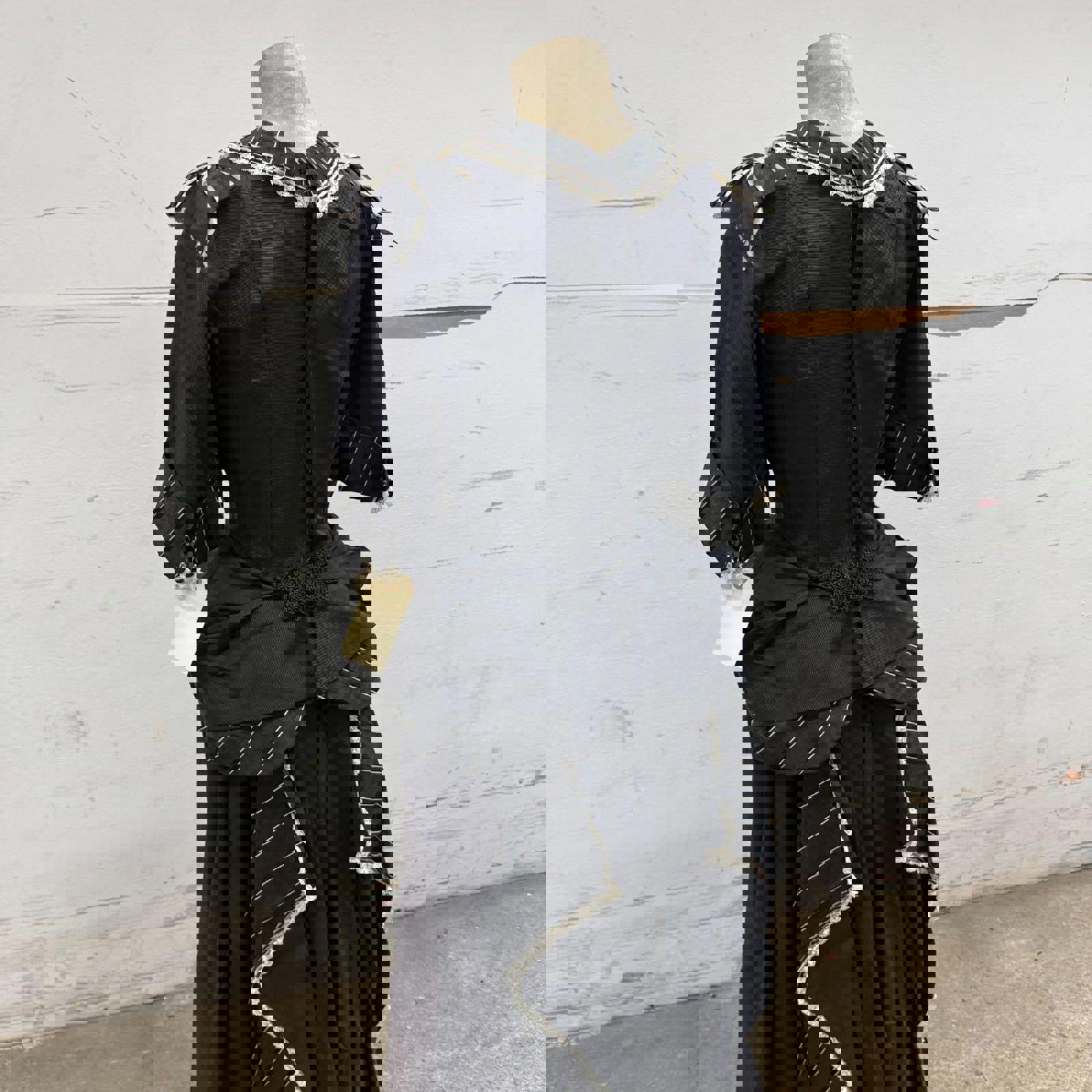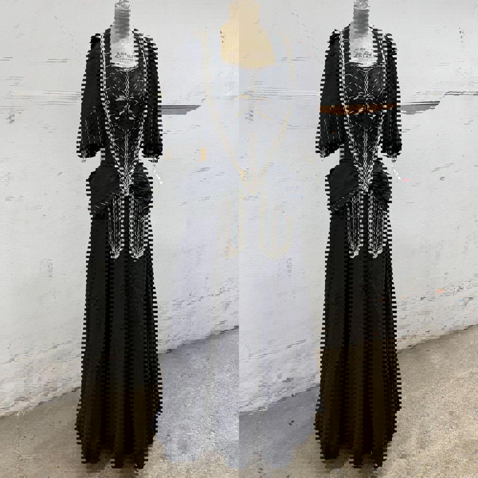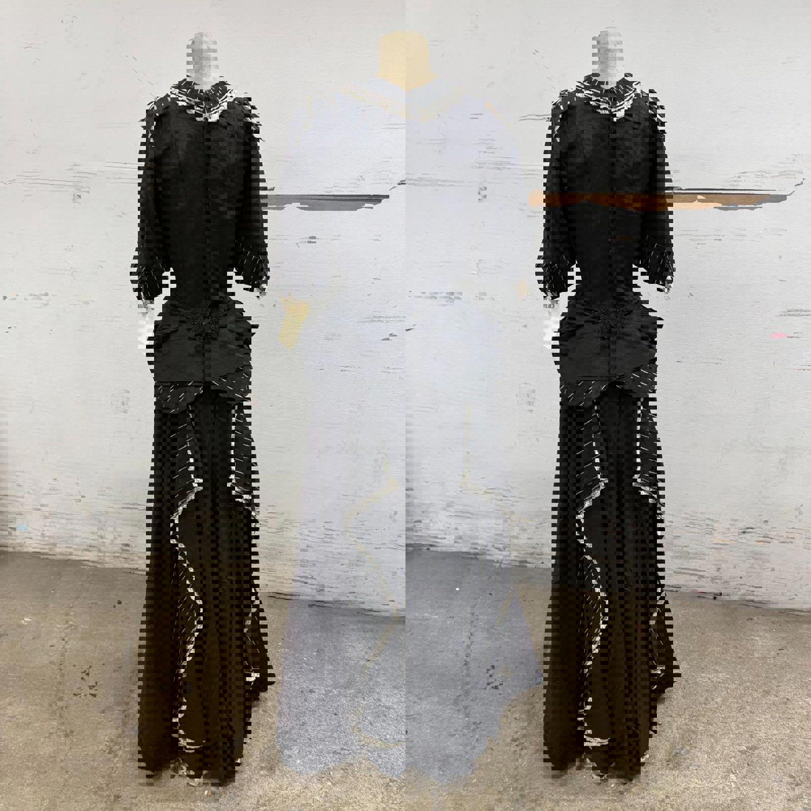 An absolute masterpiece of mid-century costume design, this floor-length mourning-style gown replicates the somber elegance of the late 19th century. Crafted from a heavy black structural fabric, it features an incredibly intricate bodice with white pinstripe paneling, delicate cream lace trim, and a romantic bow detail at the bust. The silhouette is defined by dramatic "pannier" style hip swags and a voluminous, heavily pleated skirt that trails into a slight bustle-effect in the back. Sourced directly from a closed, iconic Old Hollywood costume rental house, this museum-quality garment carries the authentic pedigree of professional film history.