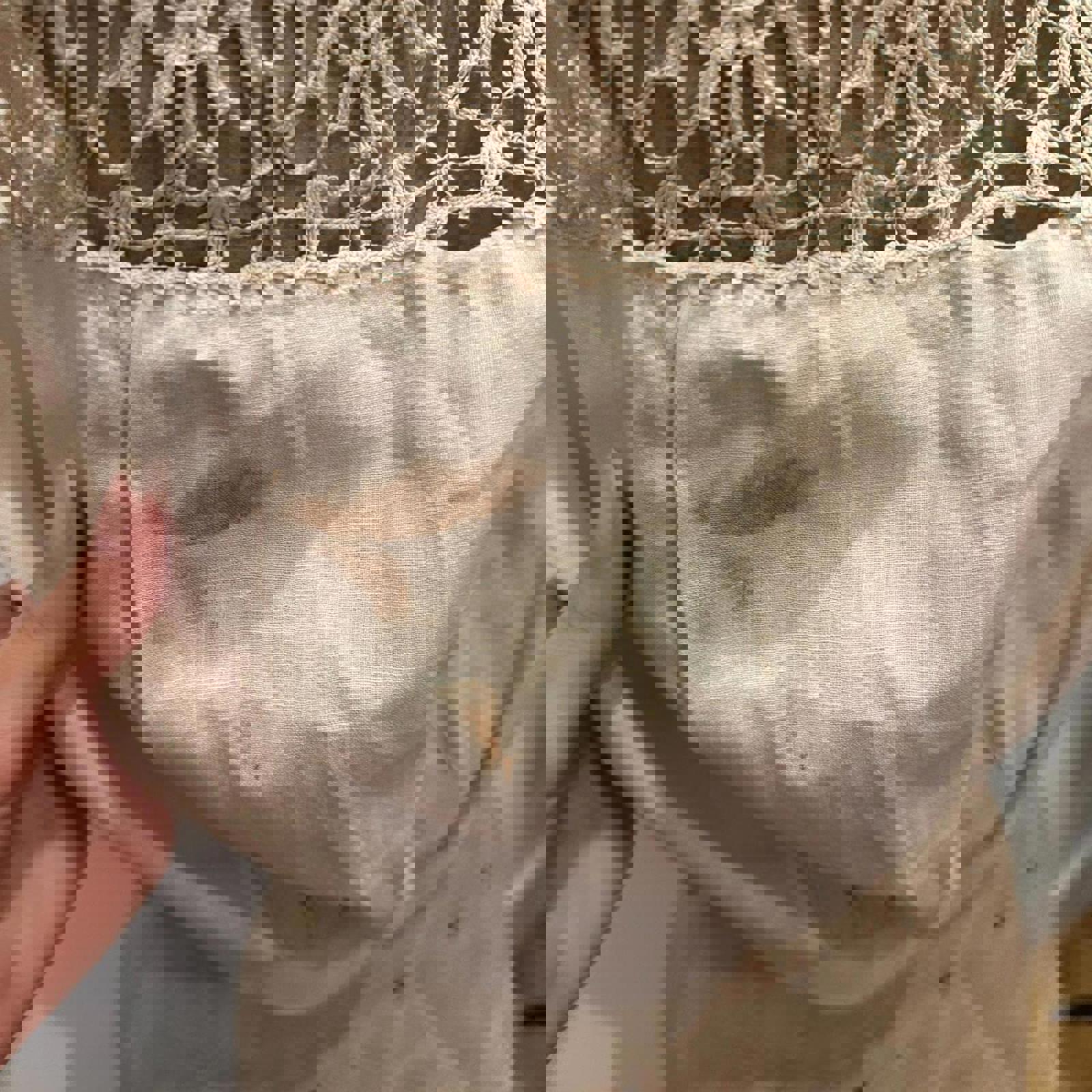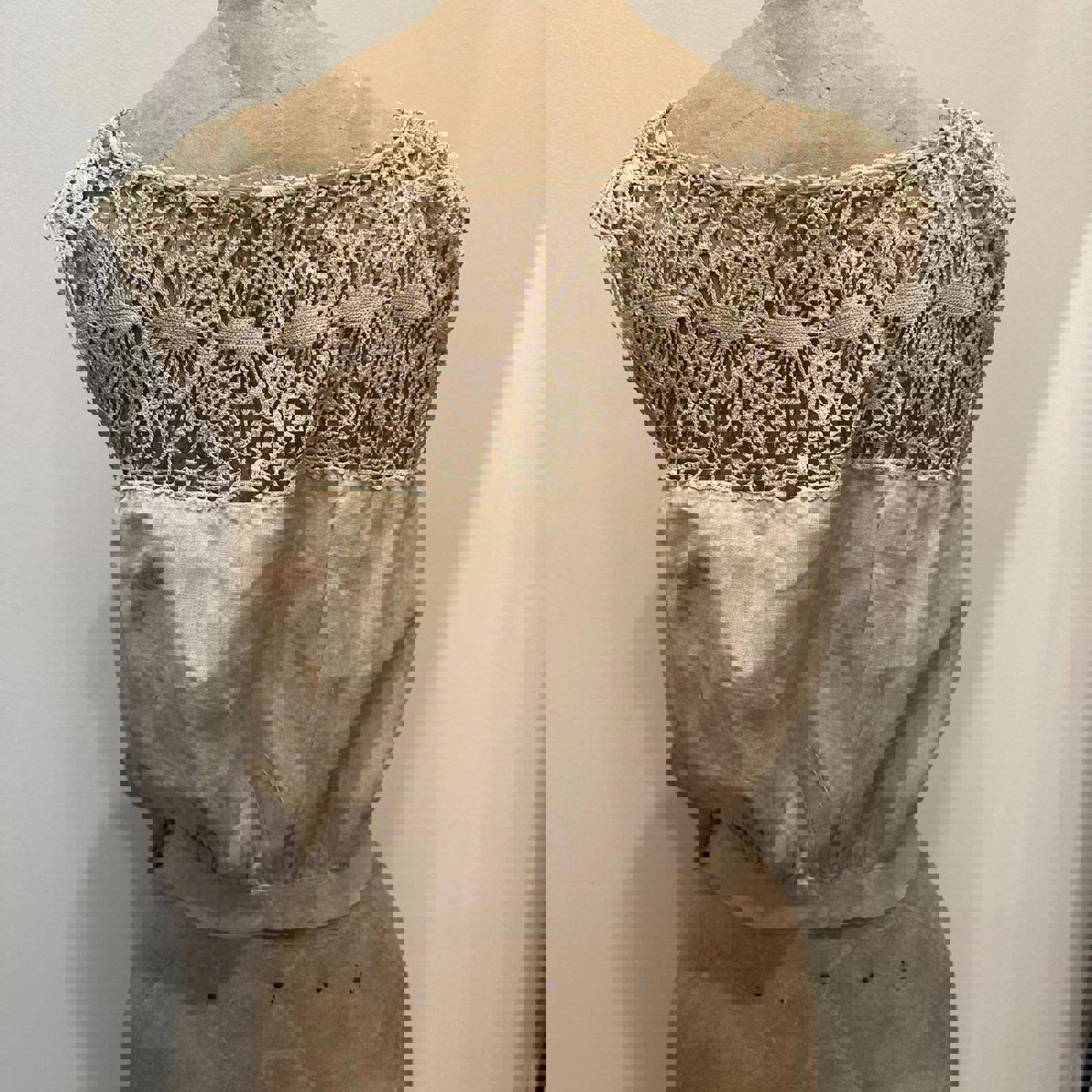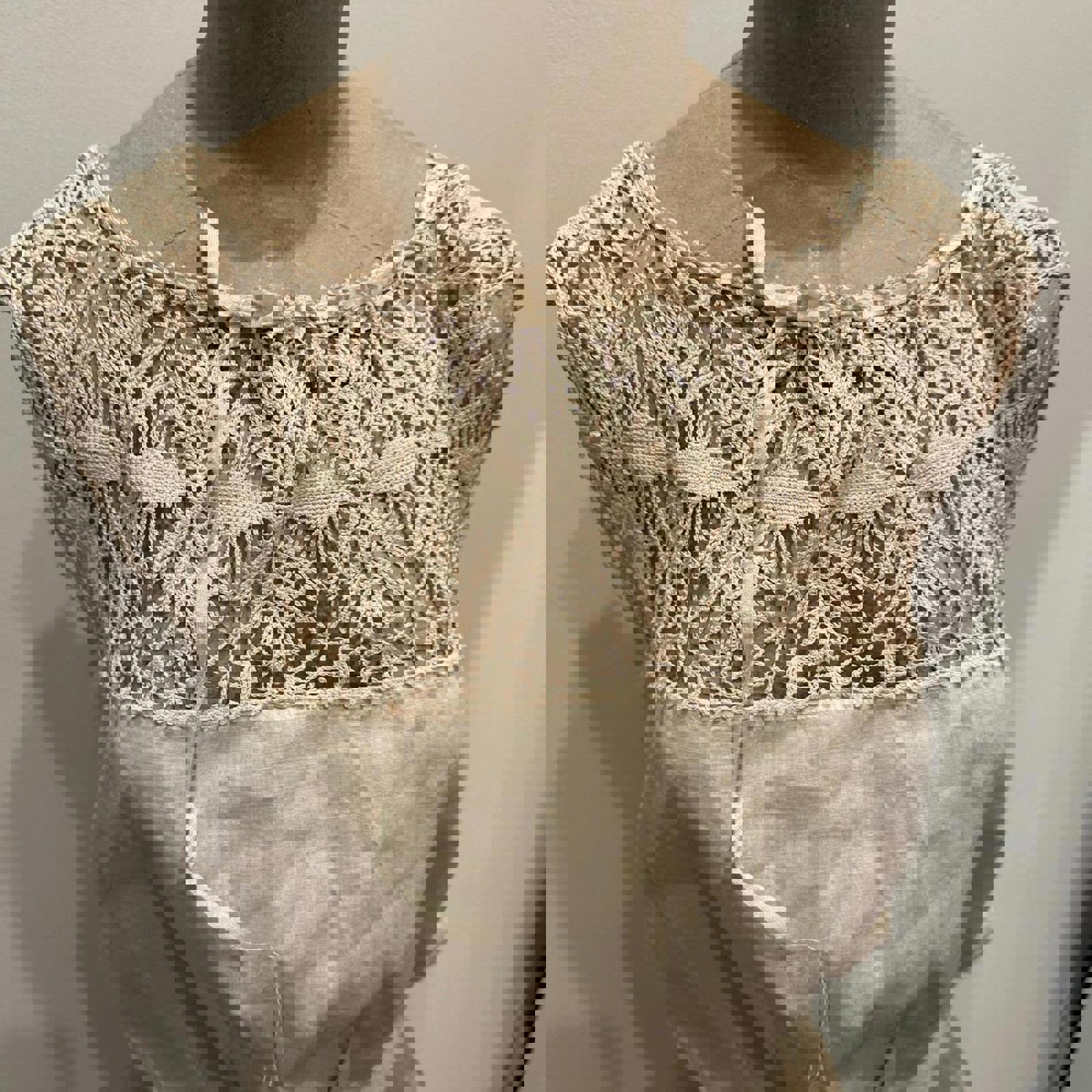 Delicate early 1900s cotton camisole featuring intricate hand-crocheted lace across the shoulders and neckline, forming a softly scalloped yoke. The lower body is made of fine, lightweight cotton with subtle gathering at the waist and side button closures. The lacework displays exquisite craftsmanship.
