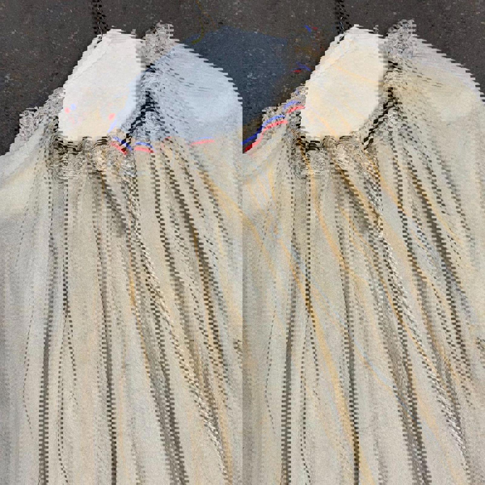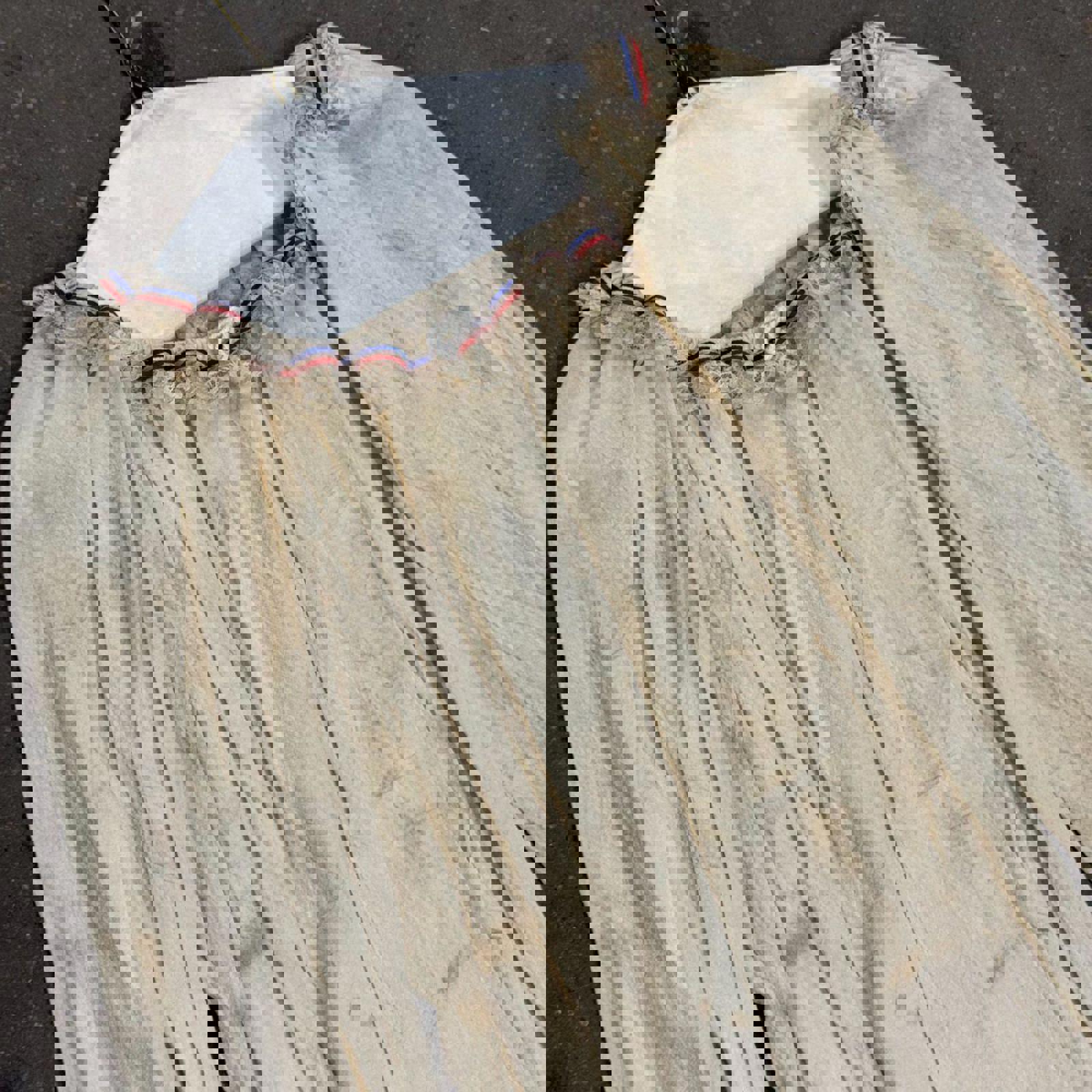 Authentic mid-century "Does Victorian" archival blouse from a prominent Hollywood costume house. This piece features superior construction designed for film durability and historical realism. Crafted from a lightweight, ivory cotton with a natural crinkle texture, it features a drawstring gathered neckline with a delicate lace-trimmed ruffle and a hidden red/navy ribbon detail. The voluminous "bishop" sleeves are finished with functional drawstring-cinched cuffs. Interior displays professional studio inventory markings including a "DBLS" character tag.