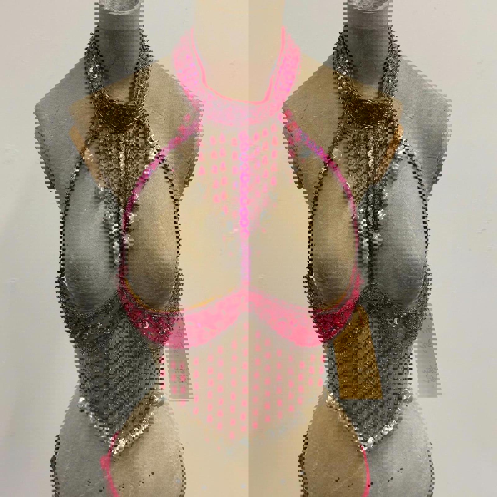 Hot pink sequin halter bra with mid-torso beaded panel