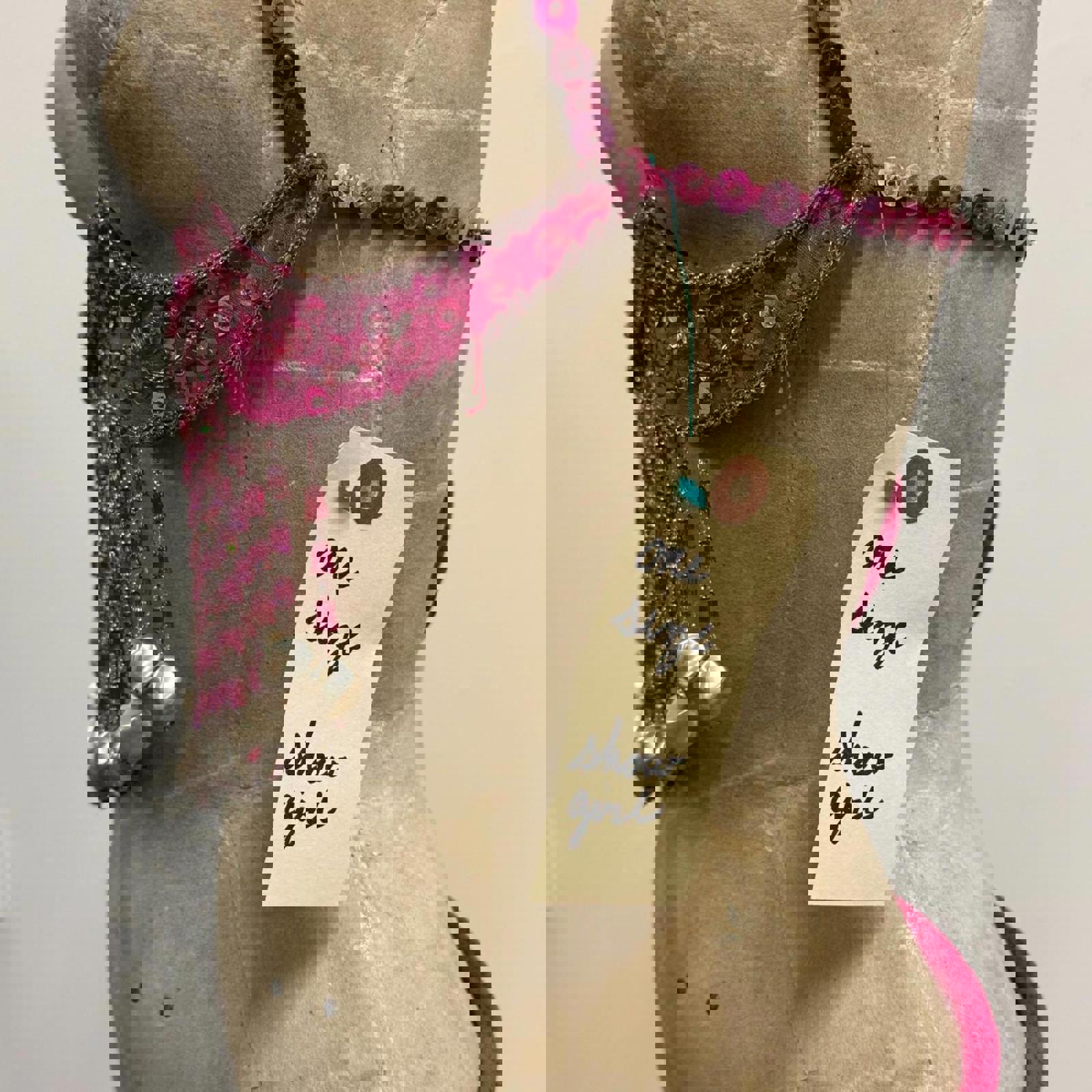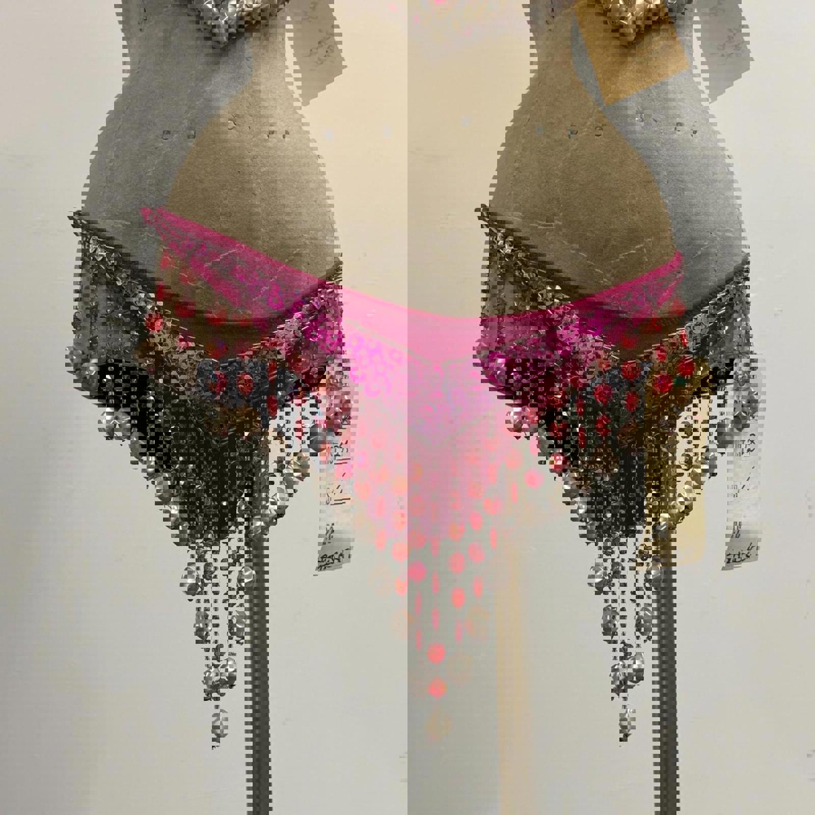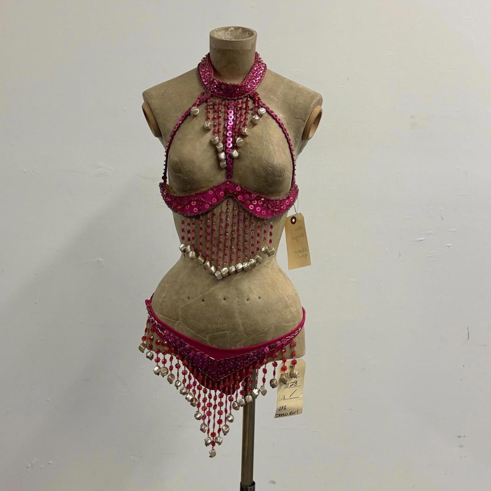 This breathtaking hot-pink showgirl set comes straight from the decommissioned wardrobe of CRC Costume Rentals, one of Los Angeles’ major costume houses for film, TV, and stage. It features a dramatic halter bra with cascading pearl and crystal fringe, paired with matching high-hip bottoms adorned with heavy beaded strands and floral sequins.