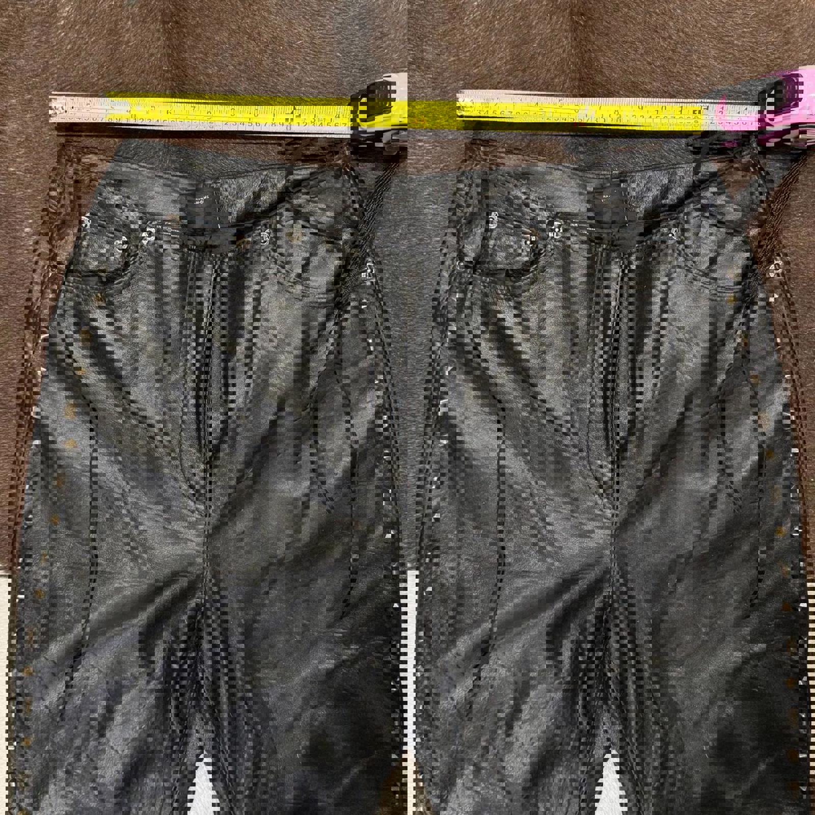 Heavyweight black leather with full stud detailing down both legs. Classic five-pocket moto cut with zip fly and reinforced knee seams. Durable, thick hide with authentic wear and patina, true vintage biker piece. As-is.