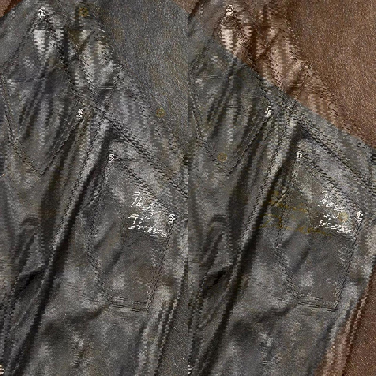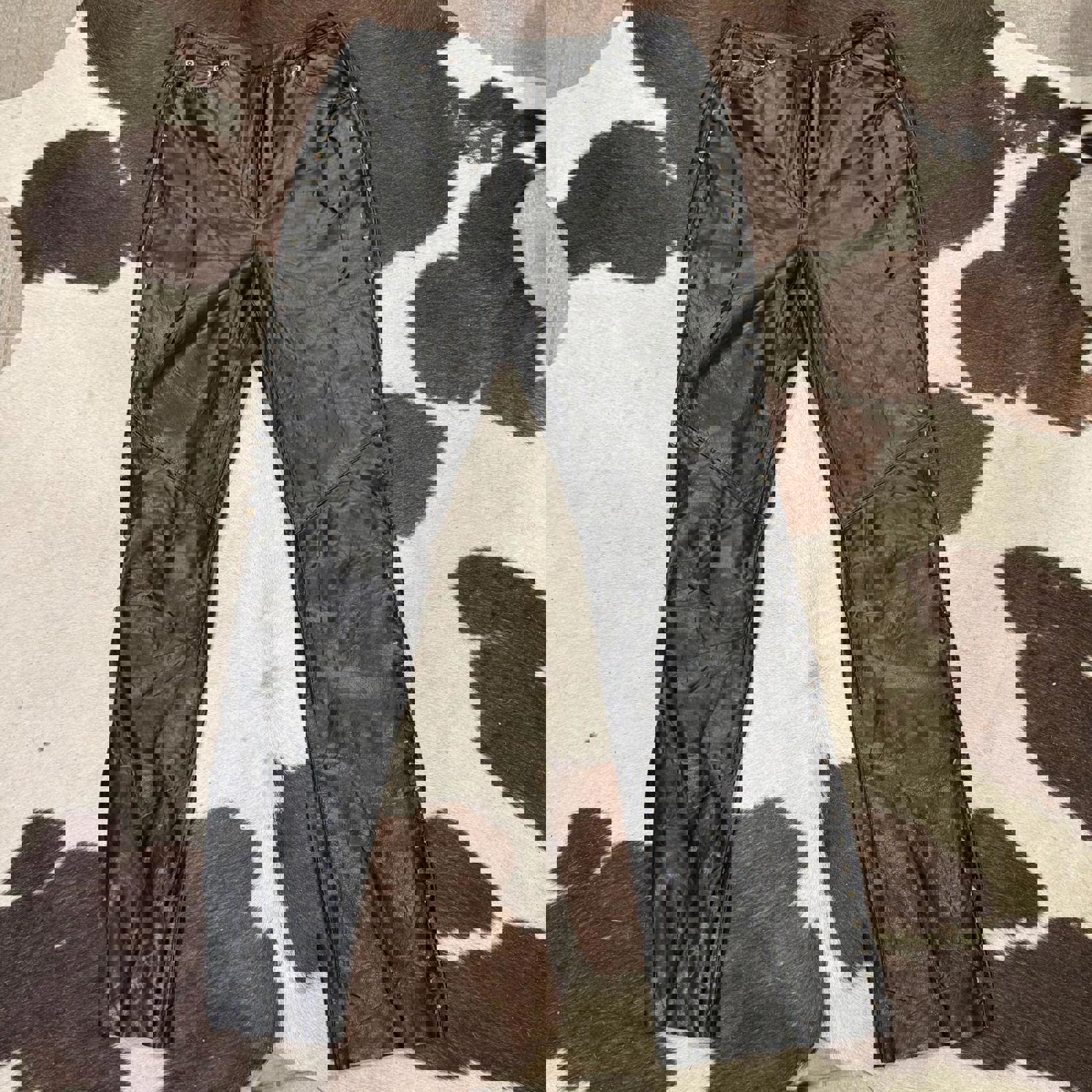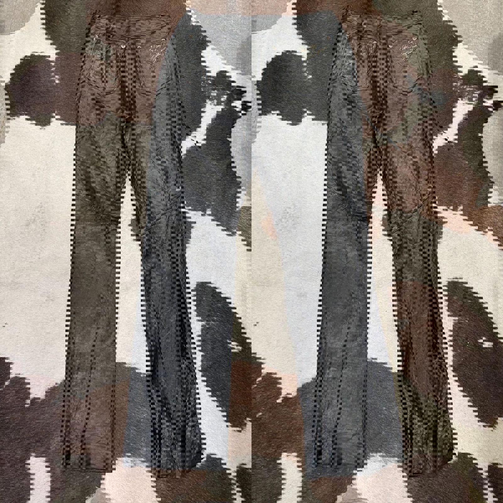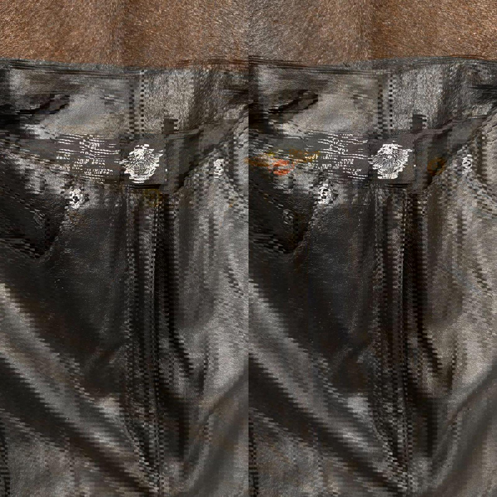 Tags: vintage Harley Davidson, studded leather pants, biker trousers, 90s moto, heavy leather
