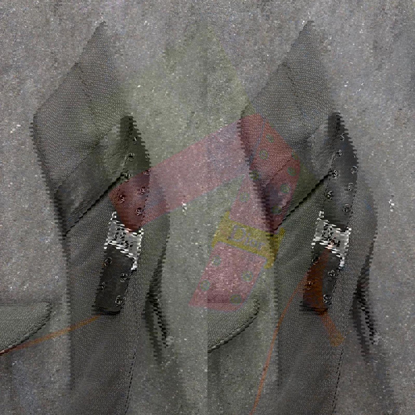 These iconic authentic booties are a definitive example of John Galliano’s utilitarian-chic era at Dior, blending military-inspired ruggedness with high-fashion hardware. Crafted from a durable olive drab canvas, these pointed-toe boots feature a structured kitten heel and dramatic leather strap detailing. The cognac brown leather wraps around the ankle, secured by bold, antiqued gold-tone hardware prominently featuring the "Dior" logo plaque and industrial grommets.