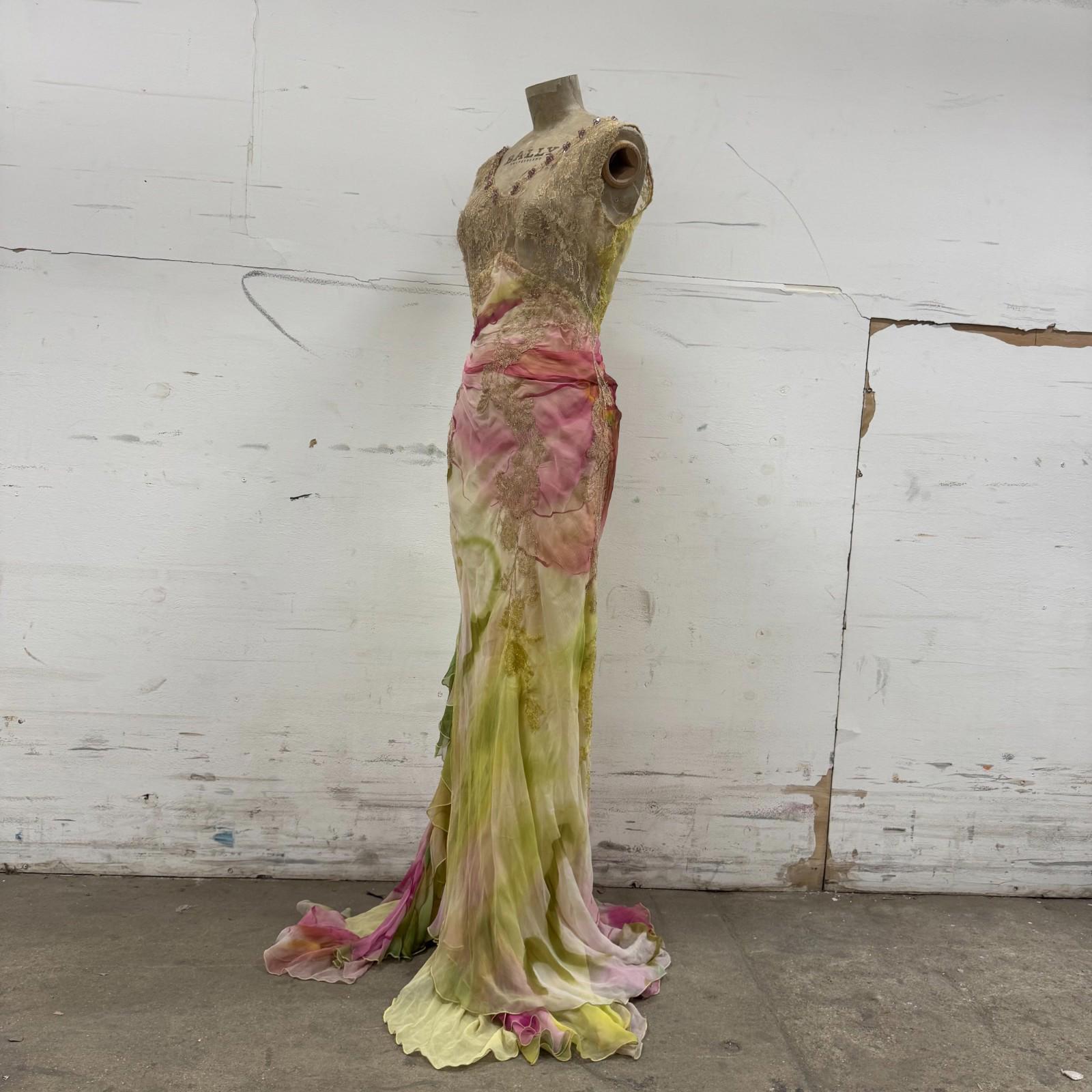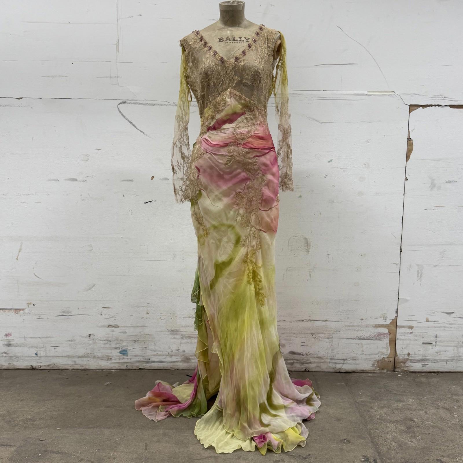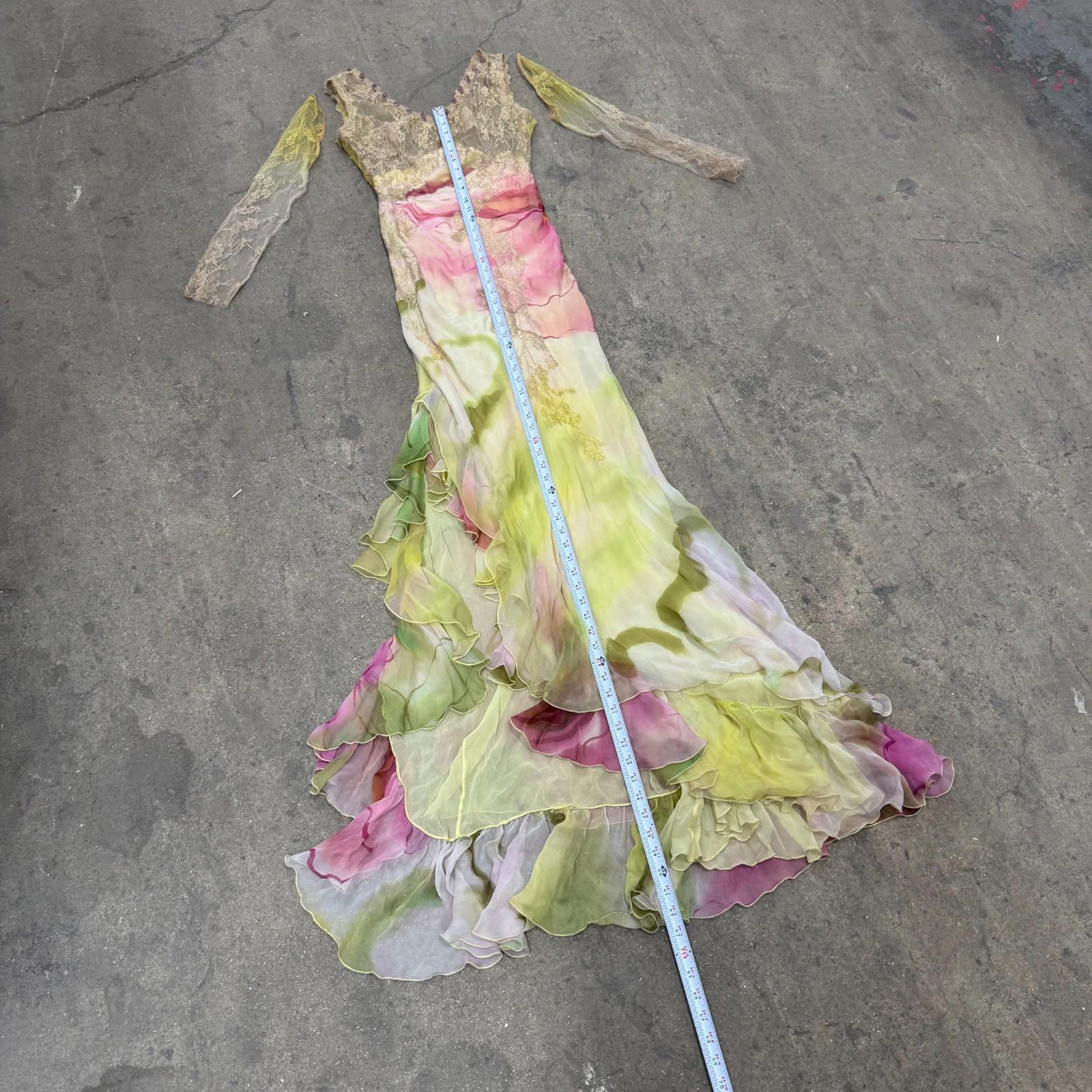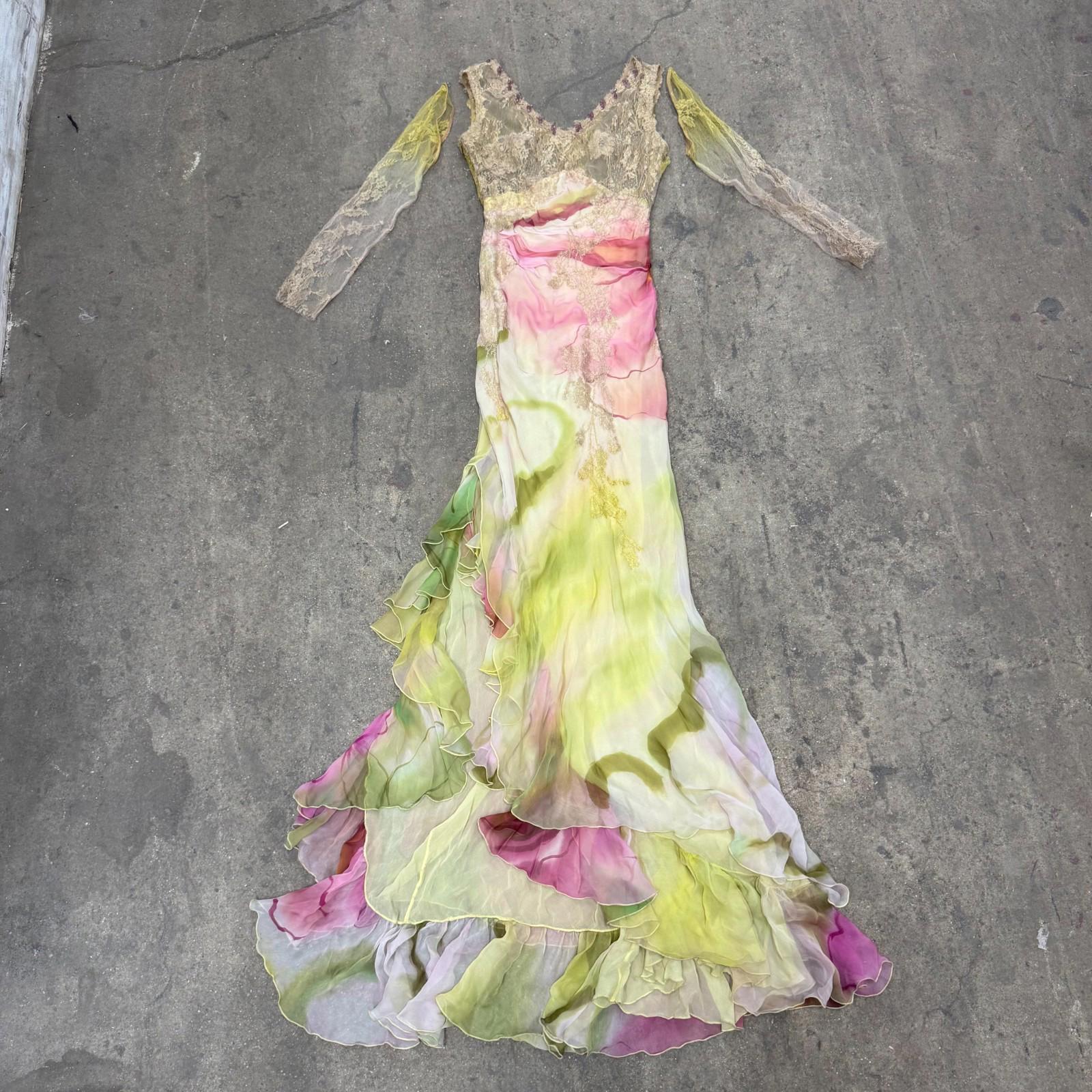 Tags: vintage gown y2k 2000s european designer silk lace ombre watercolor pink green chartreuse yellow floor length formal evening dress detachable sleeves beaded jeweled sheer romantic ethereal fairy red carpet couture galliano cavalli style statement collector luxury rare avant garde