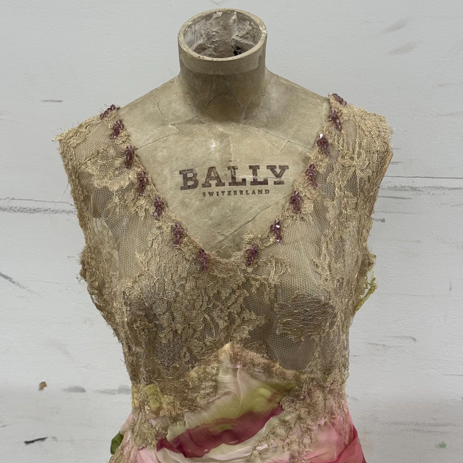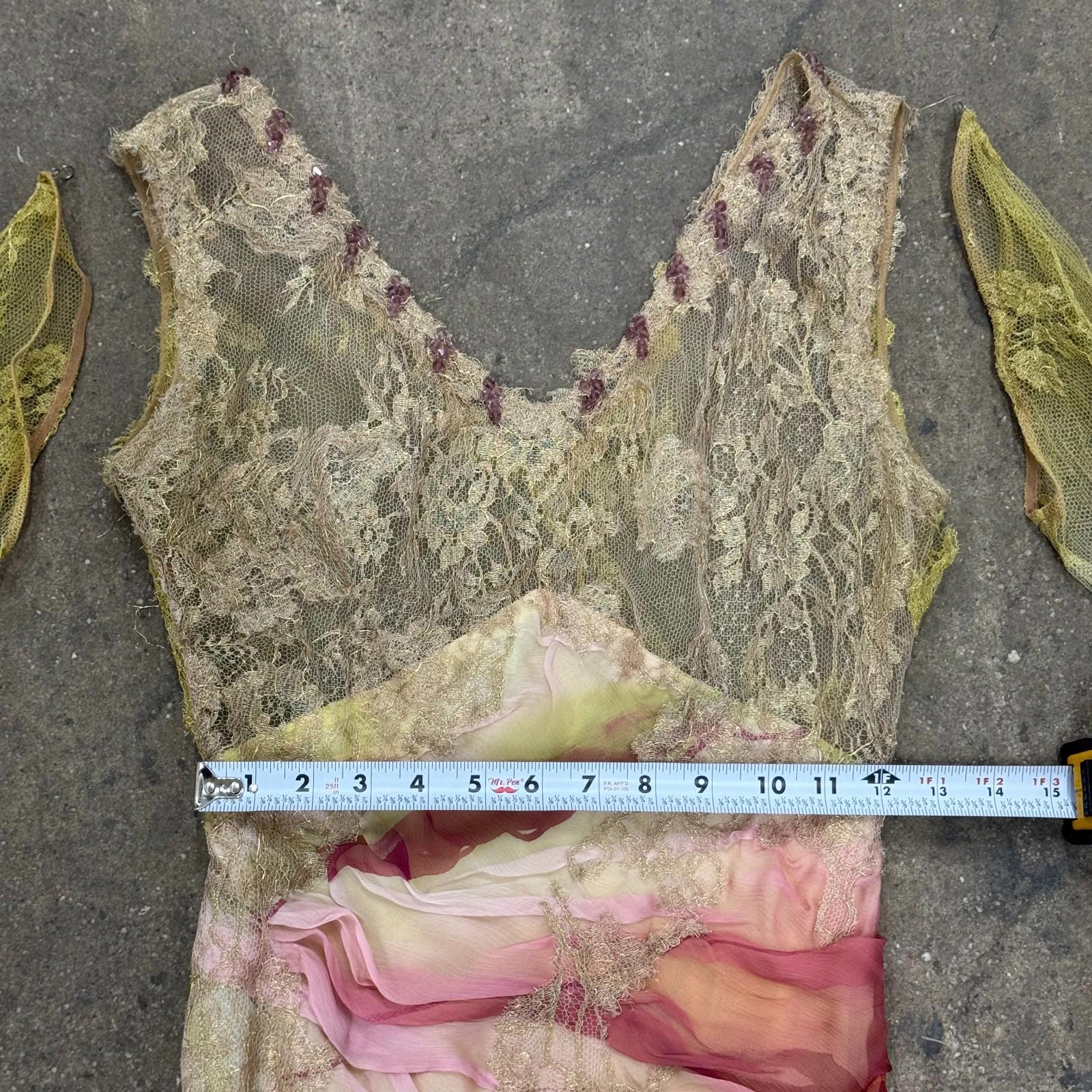 Breathtaking vintage gown in watercolor silk with stunning pink, chartreuse, and green ombré throughout. Features a sheer nude lace bodice with jeweled beading at the neckline, delicate lace overlay with raw eyelash edges, and detachable lace sleeves. Ruched silk body with dramatic floor-length silhouette and pooling train. Pure romantic fantasy.Size: XS