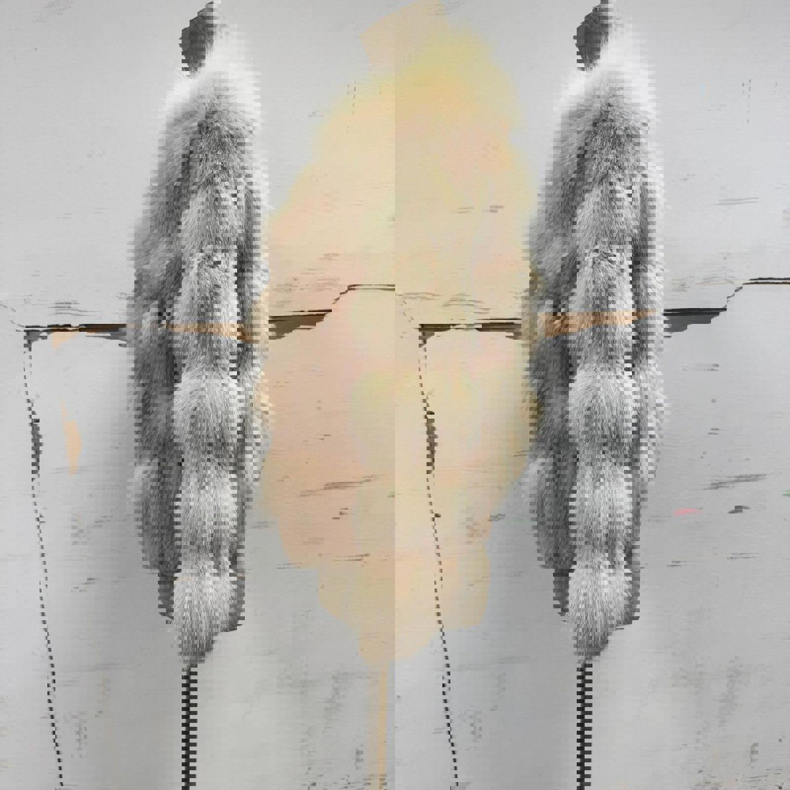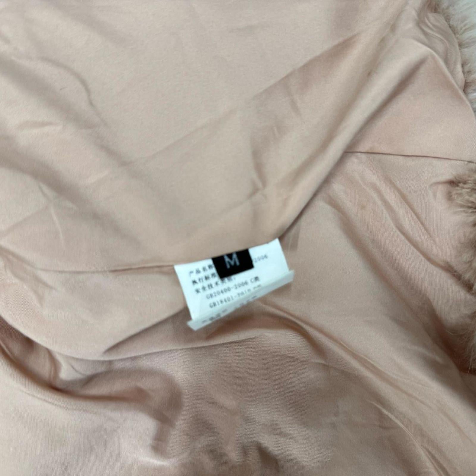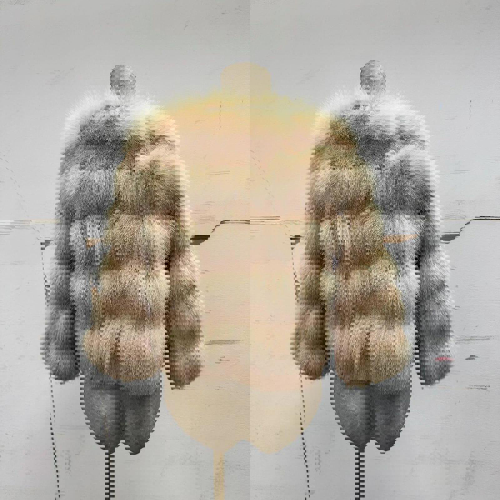 This coat features a tiered, horizontal "bubble" construction crafted from exceptionally soft genuine rabbit fur and fox fur strips in a delicate champagne-to-blush gradient.